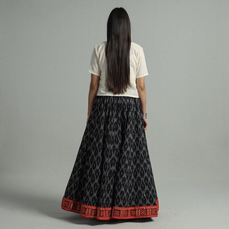 The black pochampally ikat 24 kali cotton skirt with rajasthani embroidery Border features exquisite Ikat patterns. Crafted from pure cotton, This skirt boasts a waist tie-up closure, allowing for a customized and comfortable fit. The patchwork kali design adds a unique touch. Embrace elegance and tradition with this stunning piece.