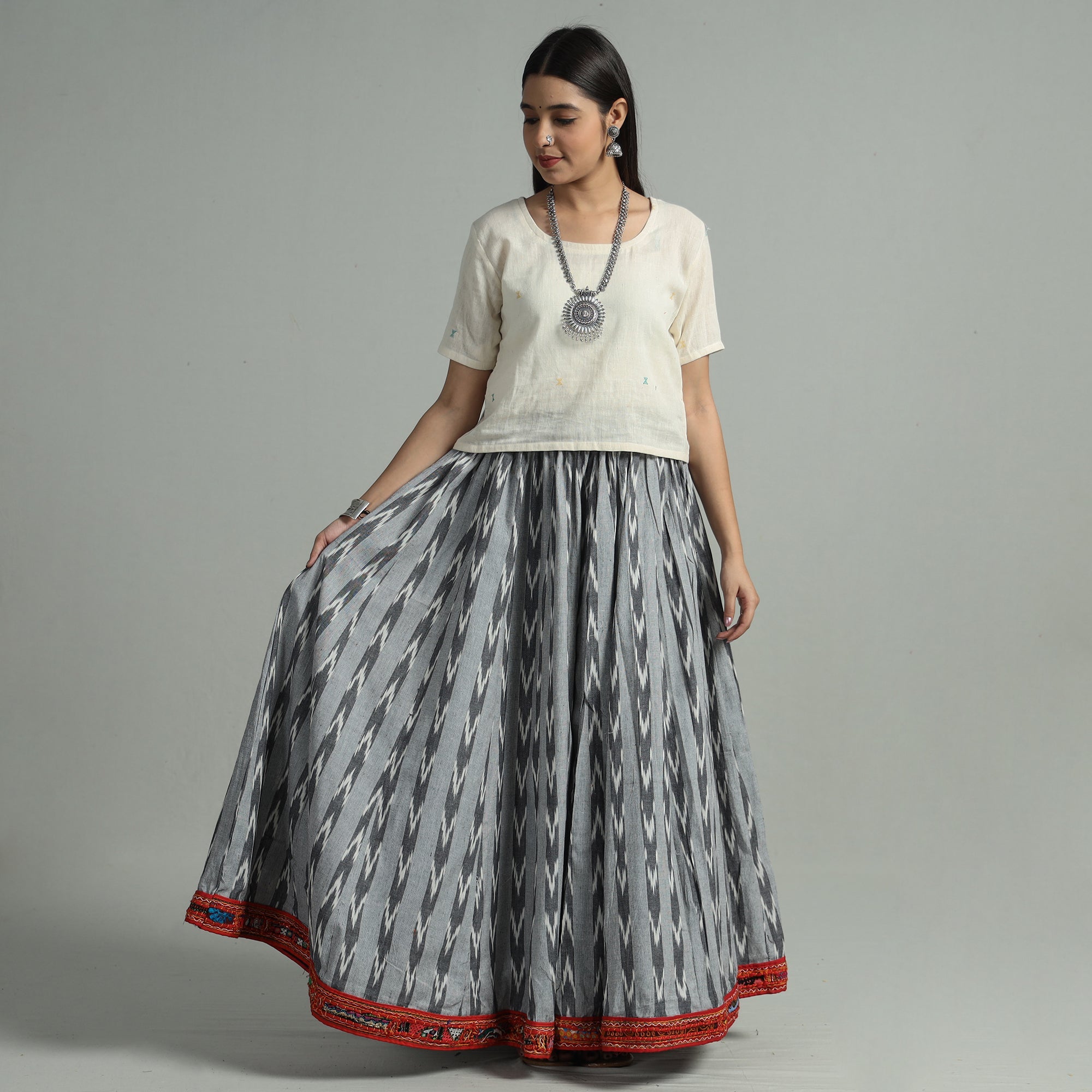 The grey pochampally ikat 24 kali cotton skirt with rajasthani embroidery Border features exquisite Ikat patterns. Crafted from pure cotton, This skirt boasts a waist tie-up closure, allowing for a customized and comfortable fit. The patchwork kali design adds a unique touch. Embrace elegance and tradition with this stunning piece.