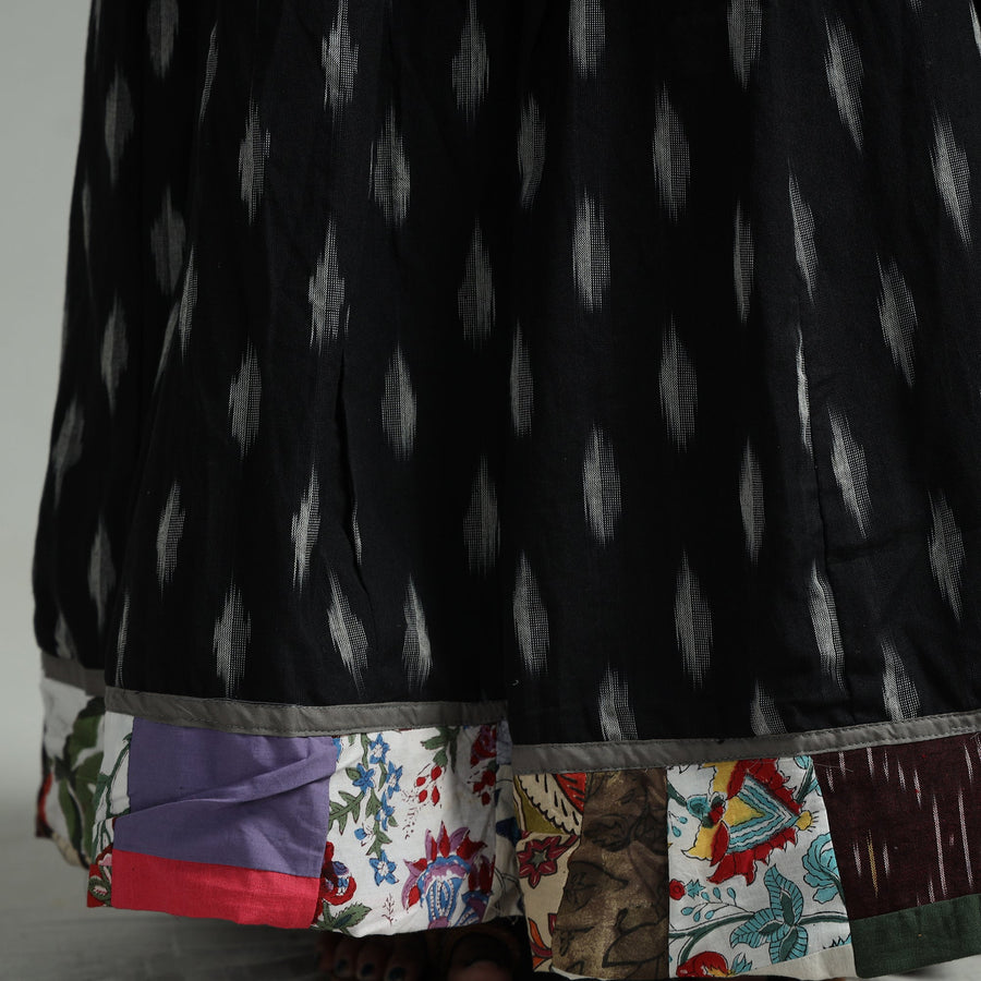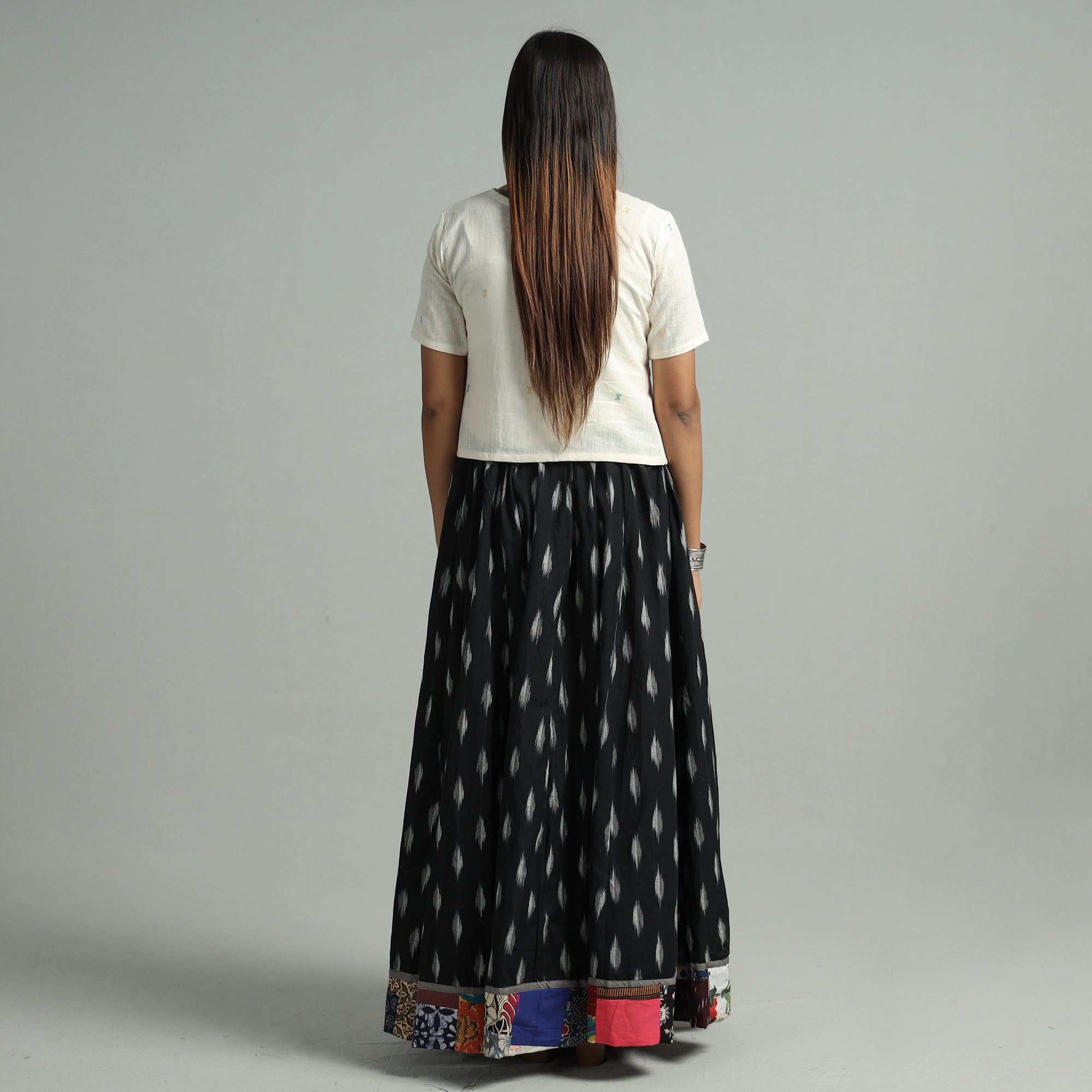 The black pochampally ikat 24 kali cotton skirt with patchwork border features exquisite Ikat patterns. Crafted from pure cotton, This skirt boasts a waist tie-up closure, allowing for a customized and comfortable fit. The patchwork kali design adds a unique touch. Embrace elegance and tradition with this stunning piece.