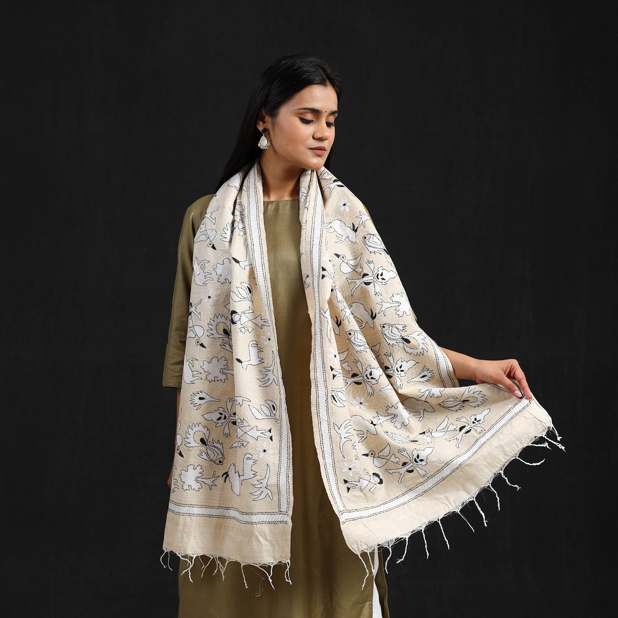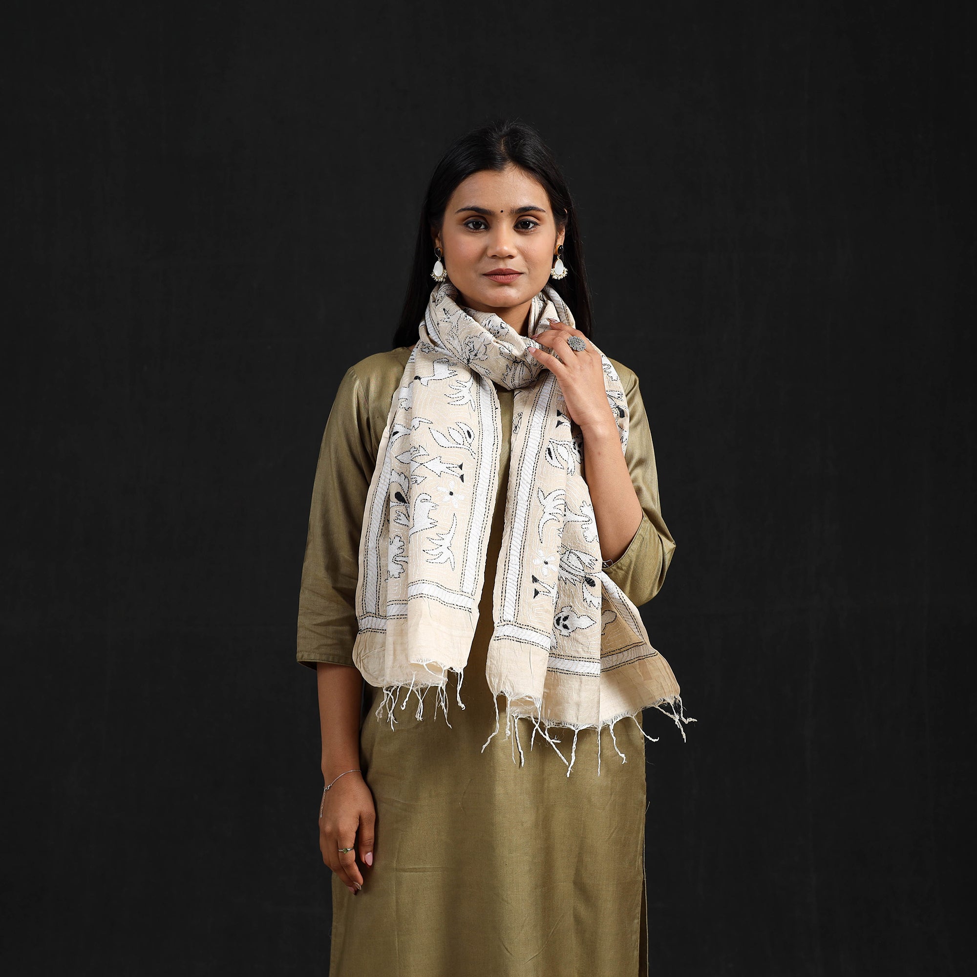 Elevate your style with our beige nakshi kantha hand embroidery desi tussar handloom stole from West Bengal. This exquisite stole is designed with contemporary patterns and has been hand-embroidered using West Bengal's traditional craft technique of Kantha. Perfect for special occasions or cultural events, this stole effortlessly combines timeless elegance with contemporary fashion.