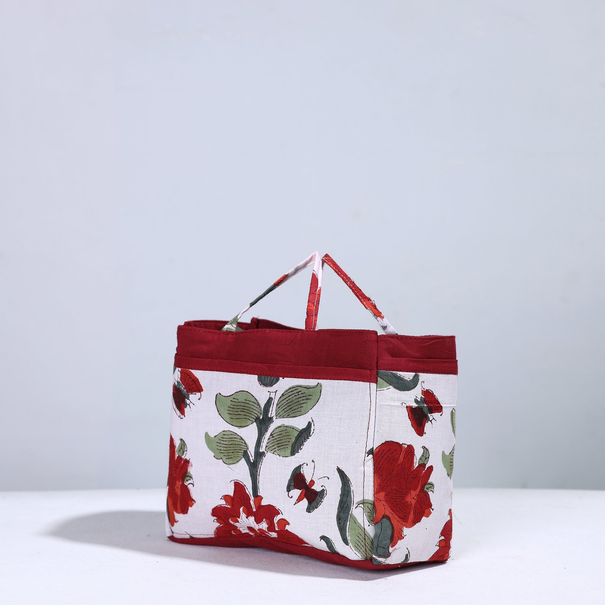 Handmade multipurpose cosmetic/toiletry bag. This bag is crafted from cotton fabric with a spill-proof plastic layer inside, textured with handmade textiles from India. It has two simple pockets, one zipper pocket inside, and four convenient pockets on the outside.