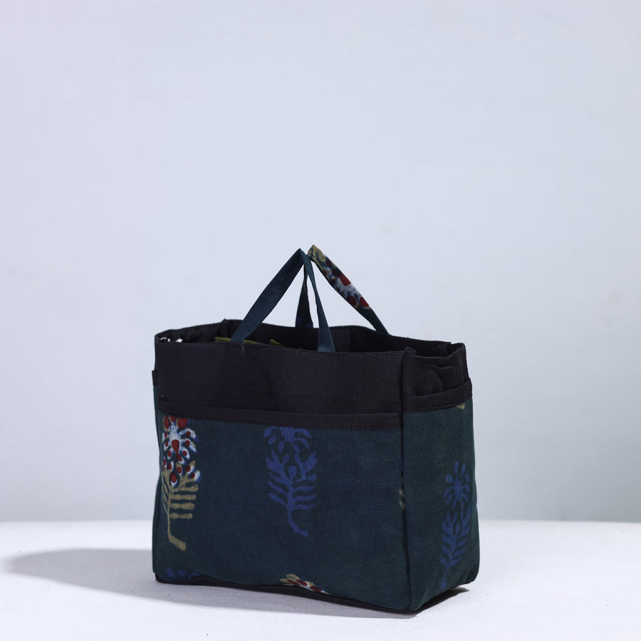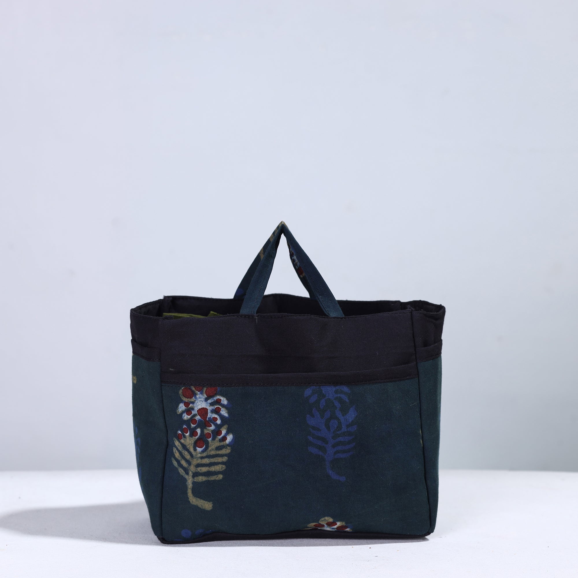 Handmade multipurpose cosmetic/toiletry bag. This bag is crafted from cotton fabric with a spill-proof plastic layer inside, textured with handmade textiles from India. It has two simple pockets, one zipper pocket inside, and four convenient pockets on the outside.