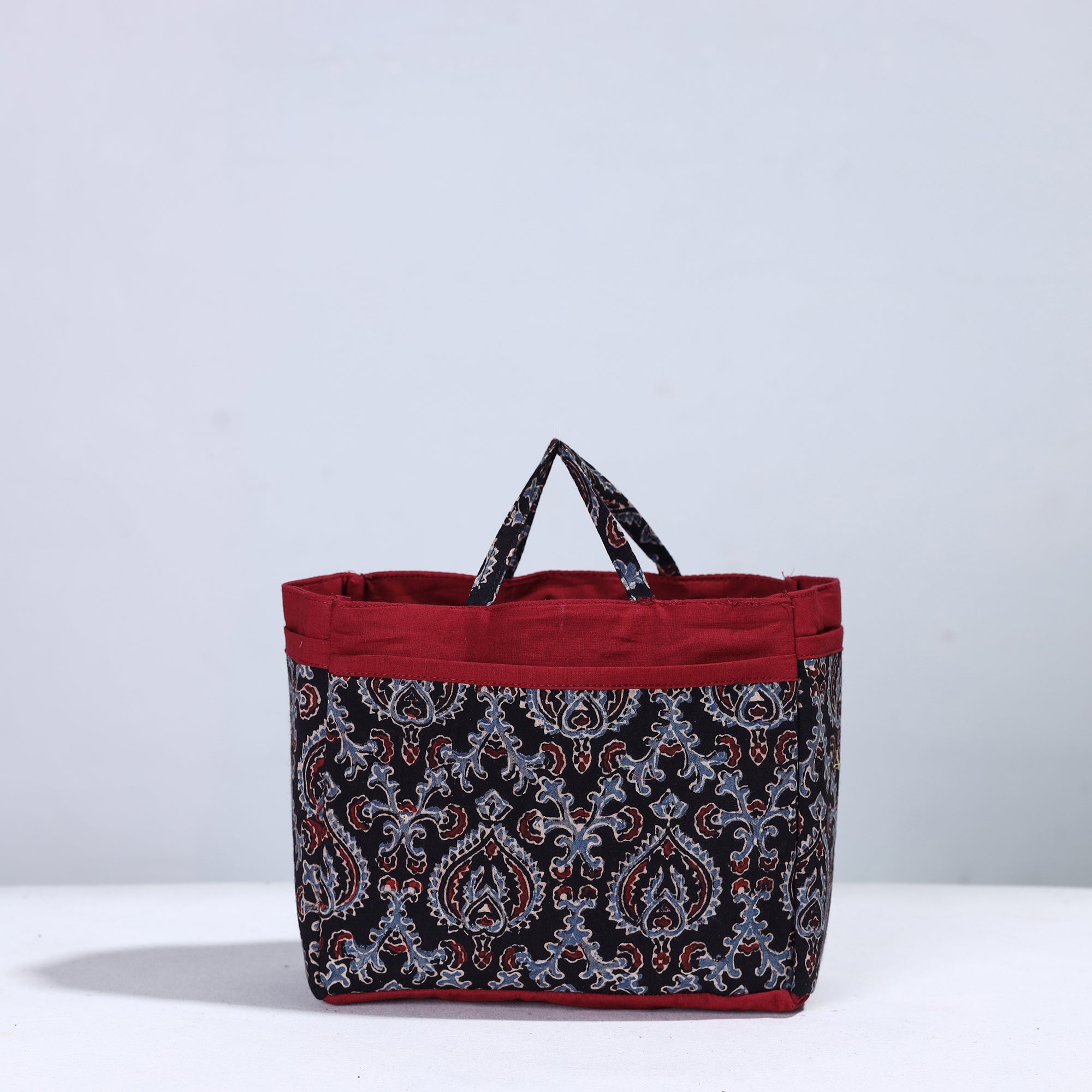 Handmade multipurpose cosmetic/toiletry bag. This bag is crafted from cotton fabric with a spill-proof plastic layer inside, textured with handmade textiles from India. It has two simple pockets, one zipper pocket inside, and four convenient pockets on the outside.