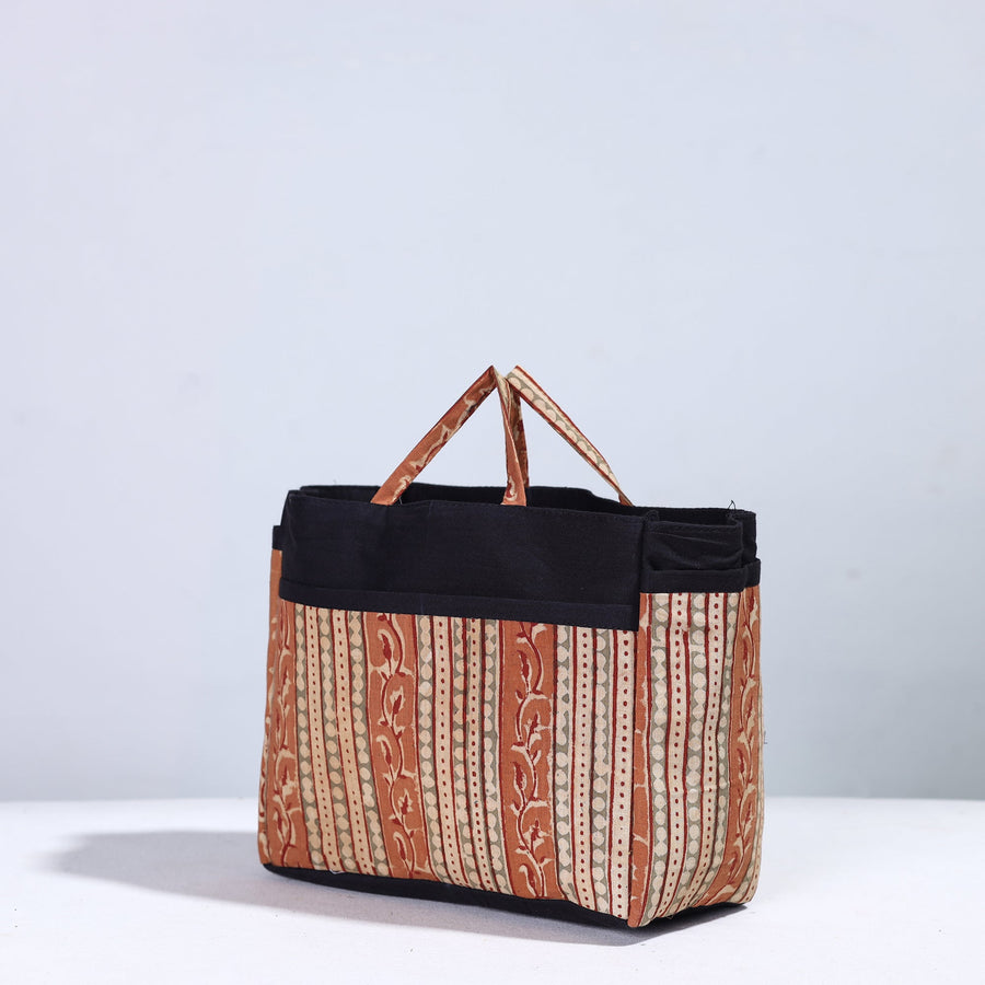 Handmade multipurpose cosmetic/toiletry bag. This bag is crafted from cotton fabric with a spill-proof plastic layer inside, textured with handmade textiles from India. It has two simple pockets, one zipper pocket inside, and four convenient pockets on the outside.