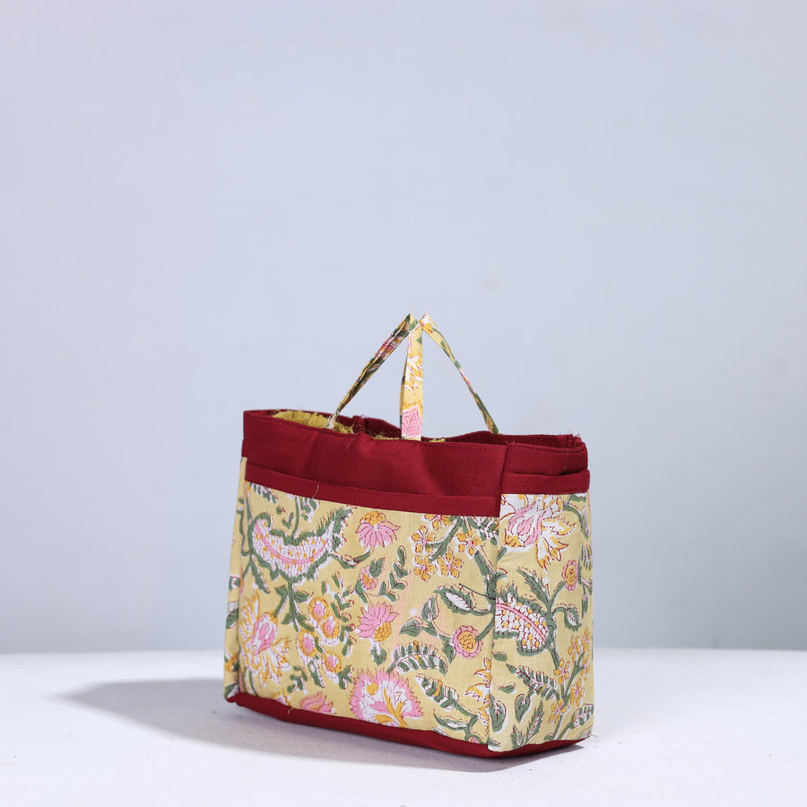 Handmade multipurpose cosmetic/toiletry bag. This bag is crafted from cotton fabric with a spill-proof plastic layer inside, textured with handmade textiles from India. It has two simple pockets, one zipper pocket inside, and four convenient pockets on the outside.