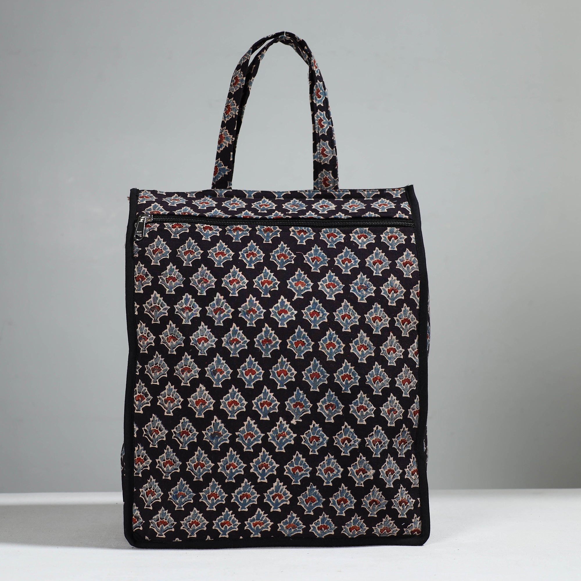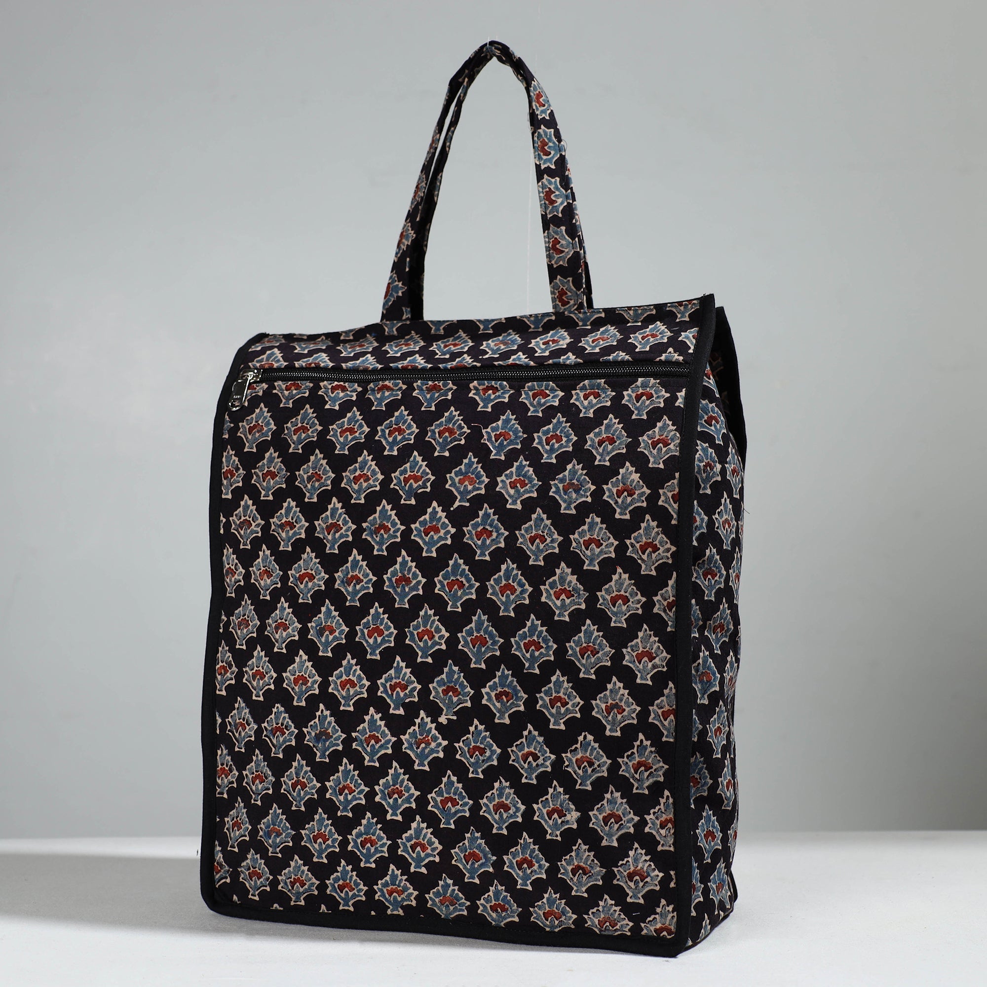 Enhance your shopping routine with our black handcrafted cotton shopping bag. This shopping bag is made from cotton fabrics.Textured with handmade textiles from India, it is a convenient, stylish, and sustainable companion for your daily shopping, and it has enough space to accommodate most of the items.