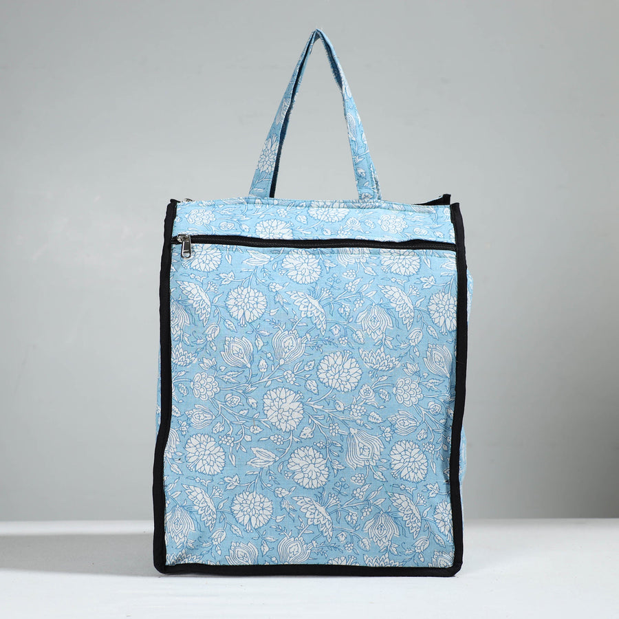 Enhance your shopping routine with our blue handcrafted cotton shopping bag. This shopping bag is made from cotton fabrics.Textured with handmade textiles from India, it is a convenient, stylish, and sustainable companion for your daily shopping, and it has enough space to accommodate most of the items.