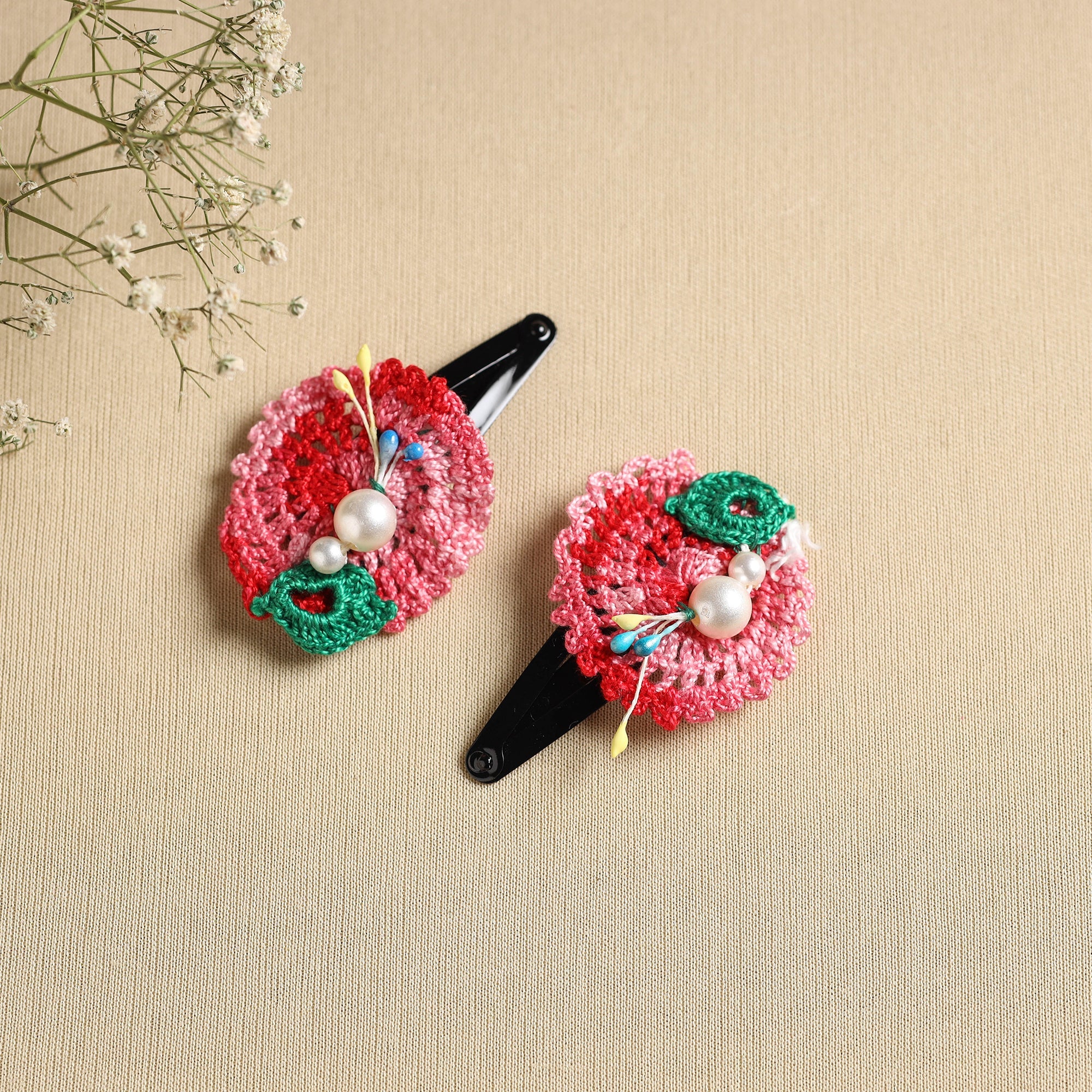 Elevate your hairdo with our handmade pink crochet tik-tak hair clip, a charming accessory crafted with precision and care. Perfect for securing loose locks or embellishing ponytails.