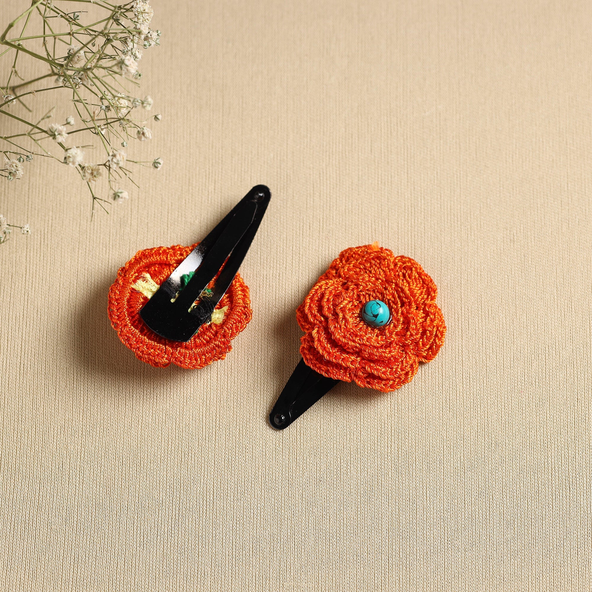 Elevate your hairdo with our handmade orange crochet tik-tak hair clip, a charming accessory crafted with precision and care. Perfect for securing loose locks or embellishing ponytails.