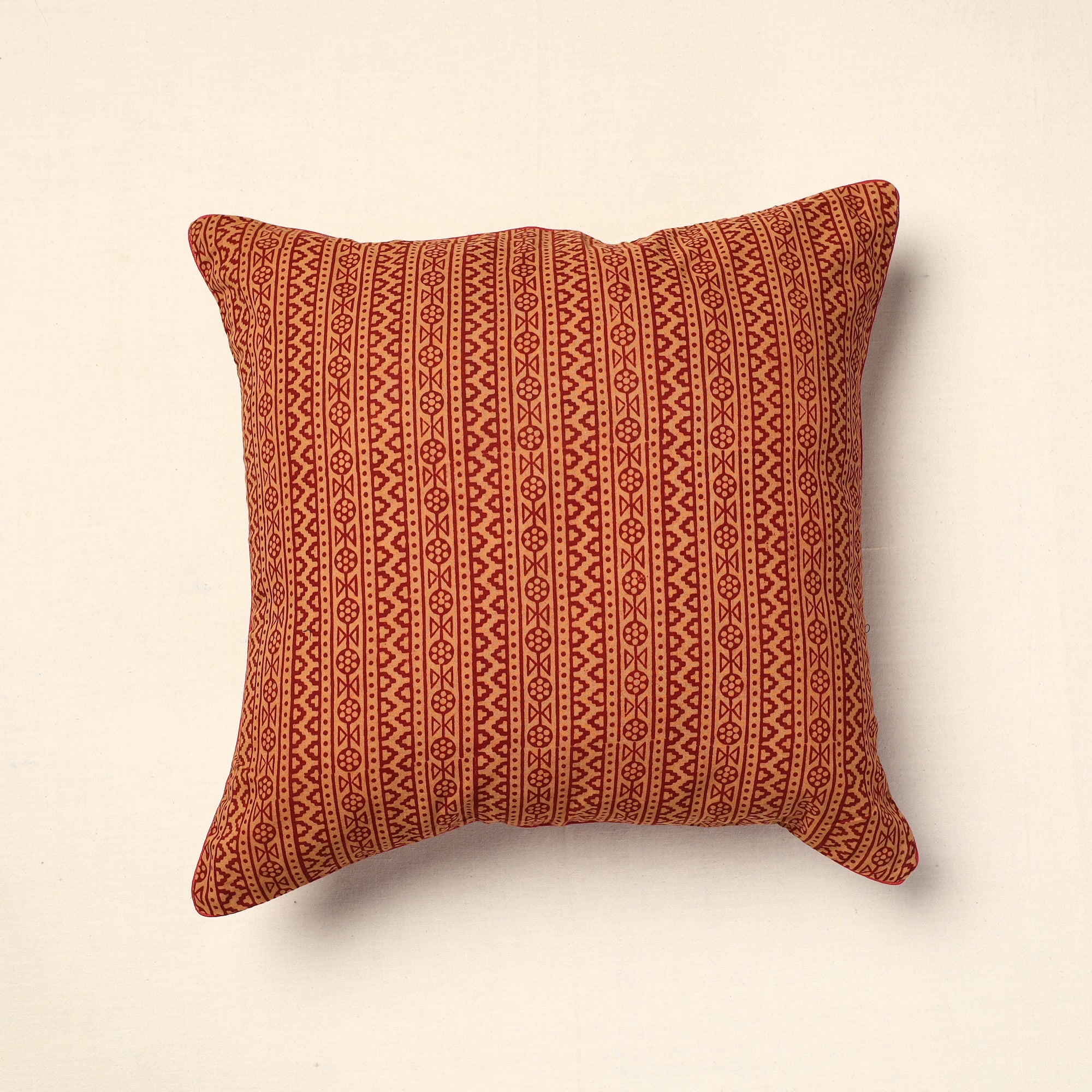 Fine quality brown bagh block printed pure cotton cushion cover, made using natural dyes through traditional processes by master artisan practiced in Bagh, the Dhar district of Madhya Pradesh.