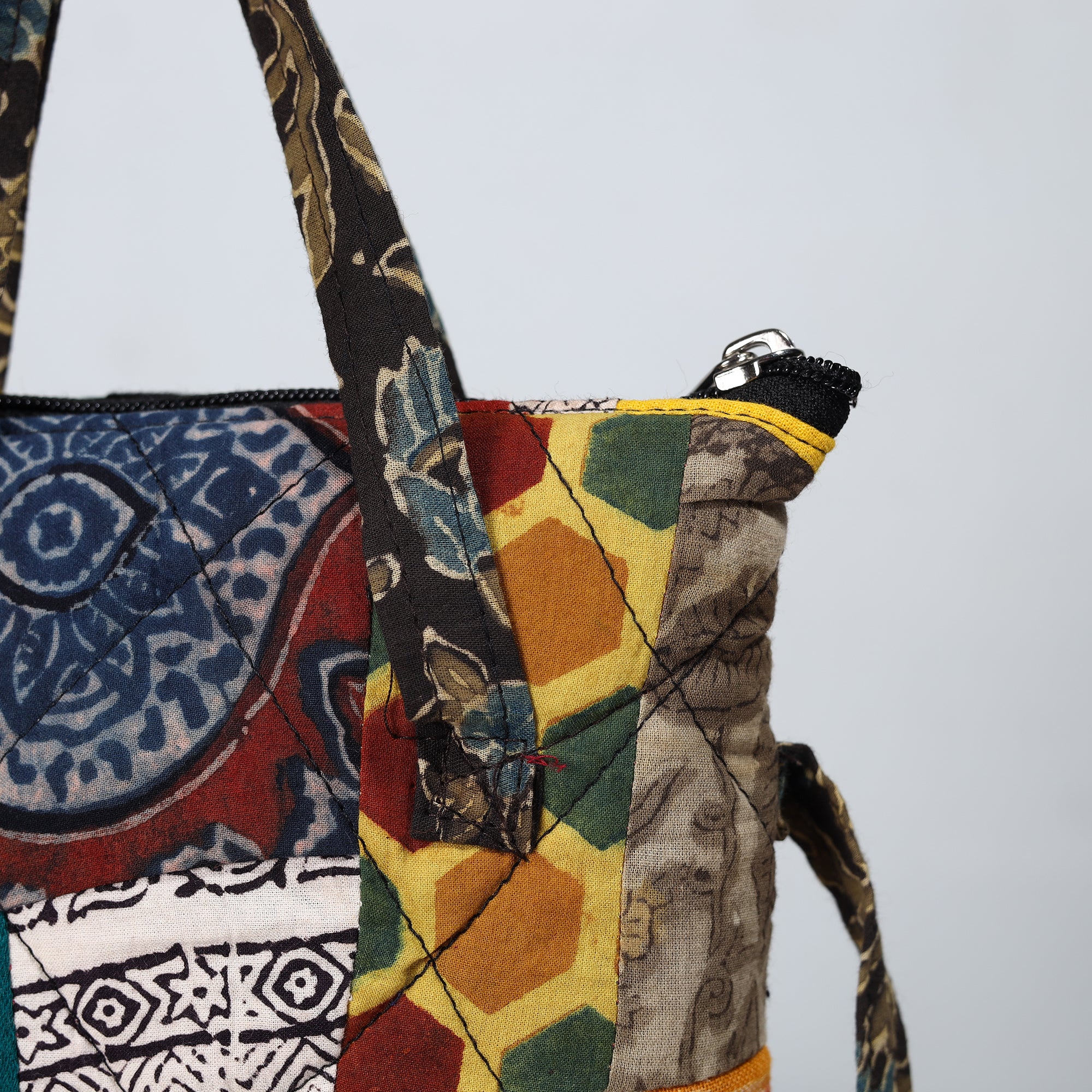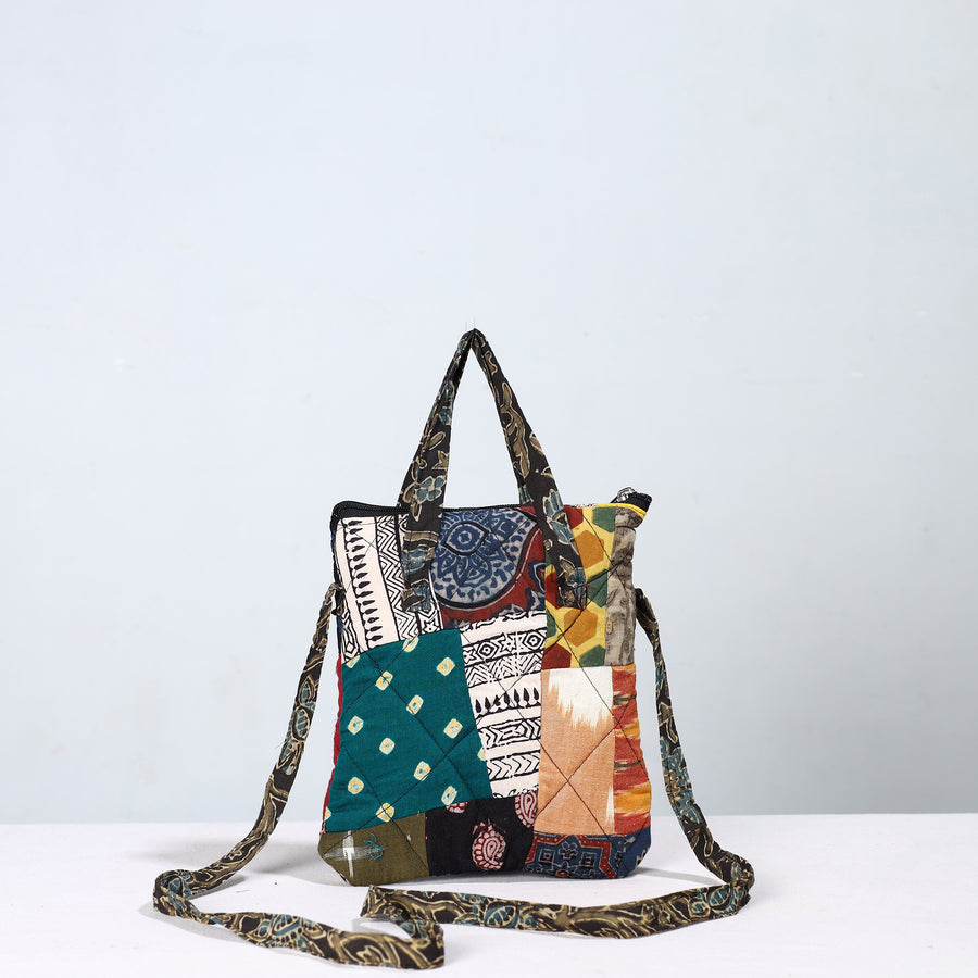 Multicolor handmade quilted cotton patchwork sling bag by Noori Bazar. This sling bag is made from a blend of cotton fabrics. This sling bag boasts four convenient pockets, providing ample space for your essentials. The foam layer lining ensures durability and protection.