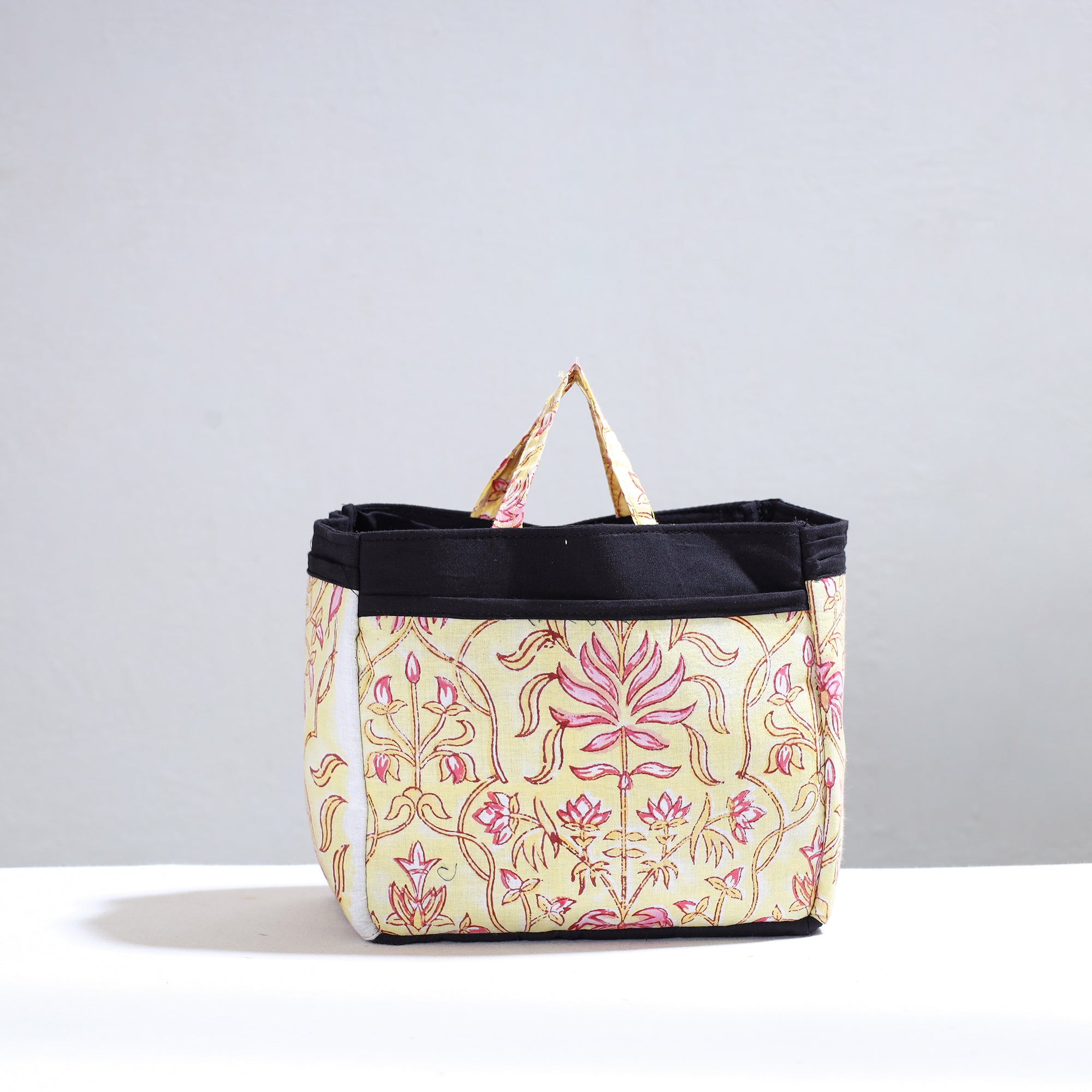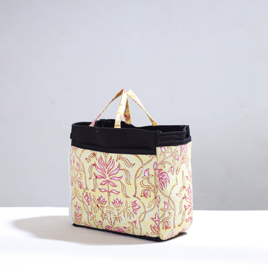 Handmade multipurpose cosmetic/toiletry bag. This bag is crafted from cotton fabric with a spill-proof plastic layer inside, textured with handmade textiles from India. It has two simple pockets, one zipper pocket inside, and four convenient pockets on the outside.