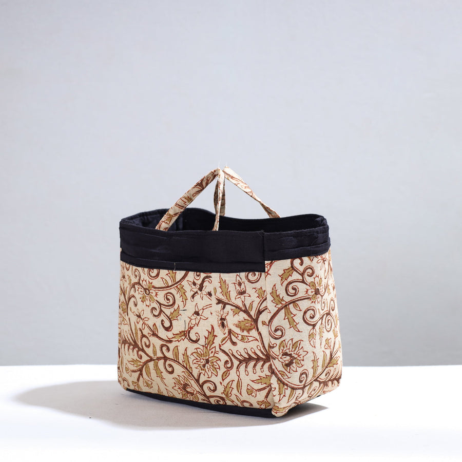 Handmade multipurpose cosmetic/toiletry bag. This bag is crafted from cotton fabric with a spill-proof plastic layer inside, textured with handmade textiles from India. It has two simple pockets, one zipper pocket inside, and four convenient pockets on the outside.
