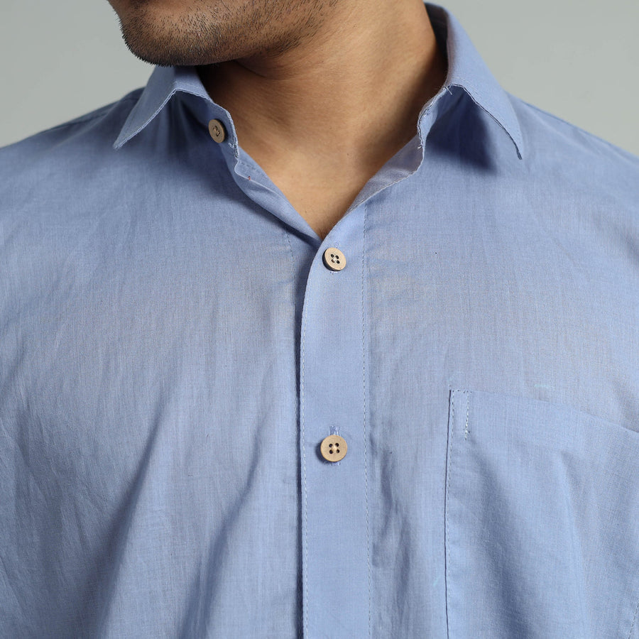 This exquisite blue plain cotton men's half-sleeve shirt is a perfect blend of style and comfort. Crafted from cotton fabric, which ensures all-day comfort, This shirt features a regular collar and half sleeves, ideal for a casual yet sophisticated look. The crisp wooden buttons add a touch of natural charm.