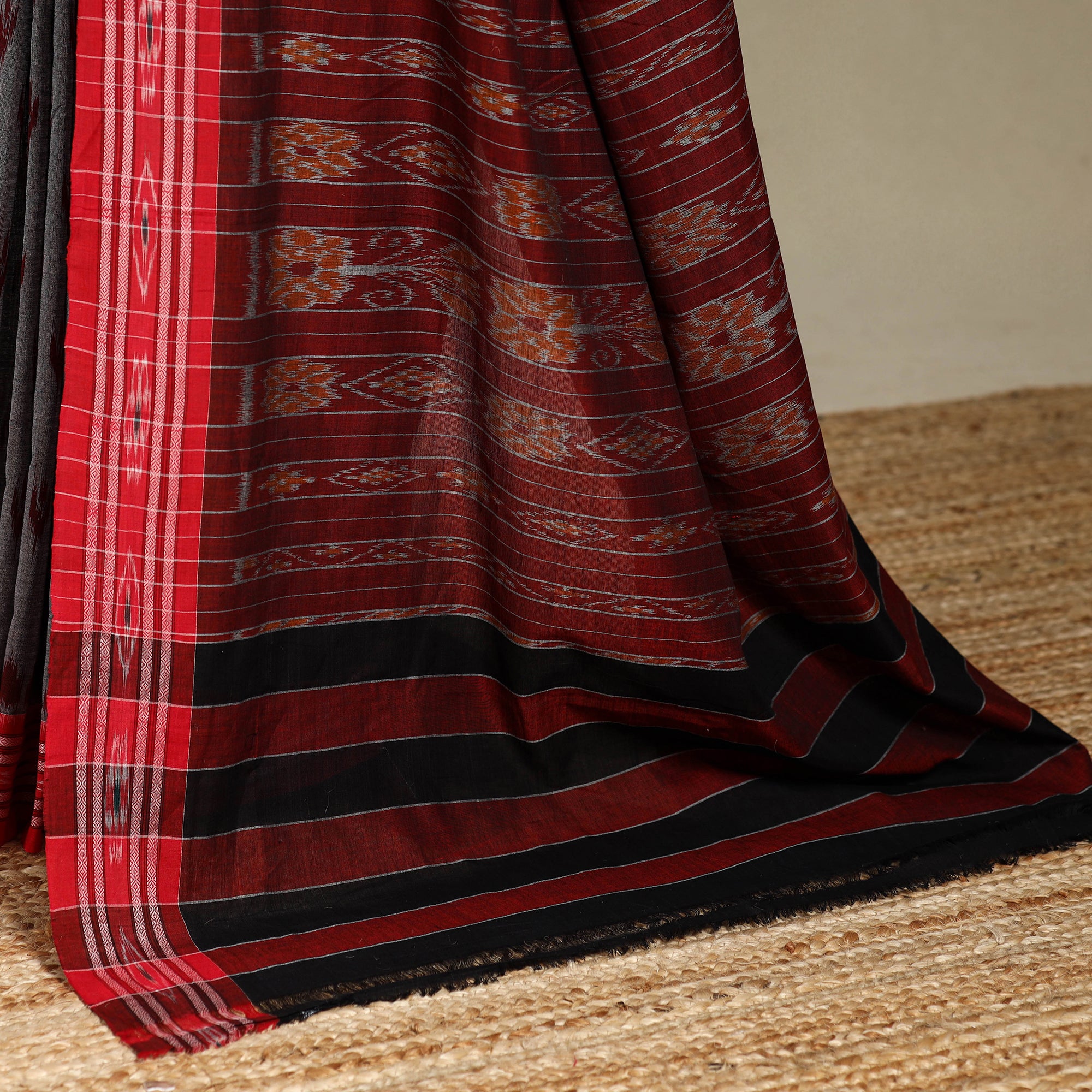 Experience the cultural richness of odisha with this grey sambalpuri Ikat handloom cotton saree, crafted by master artisans from the eastern state of Odisha. This exquisite saree showcases traditional motifs such as shankha (shell), chakra (wheel), and phula (flower), adding a touch of elegance to any occasion.