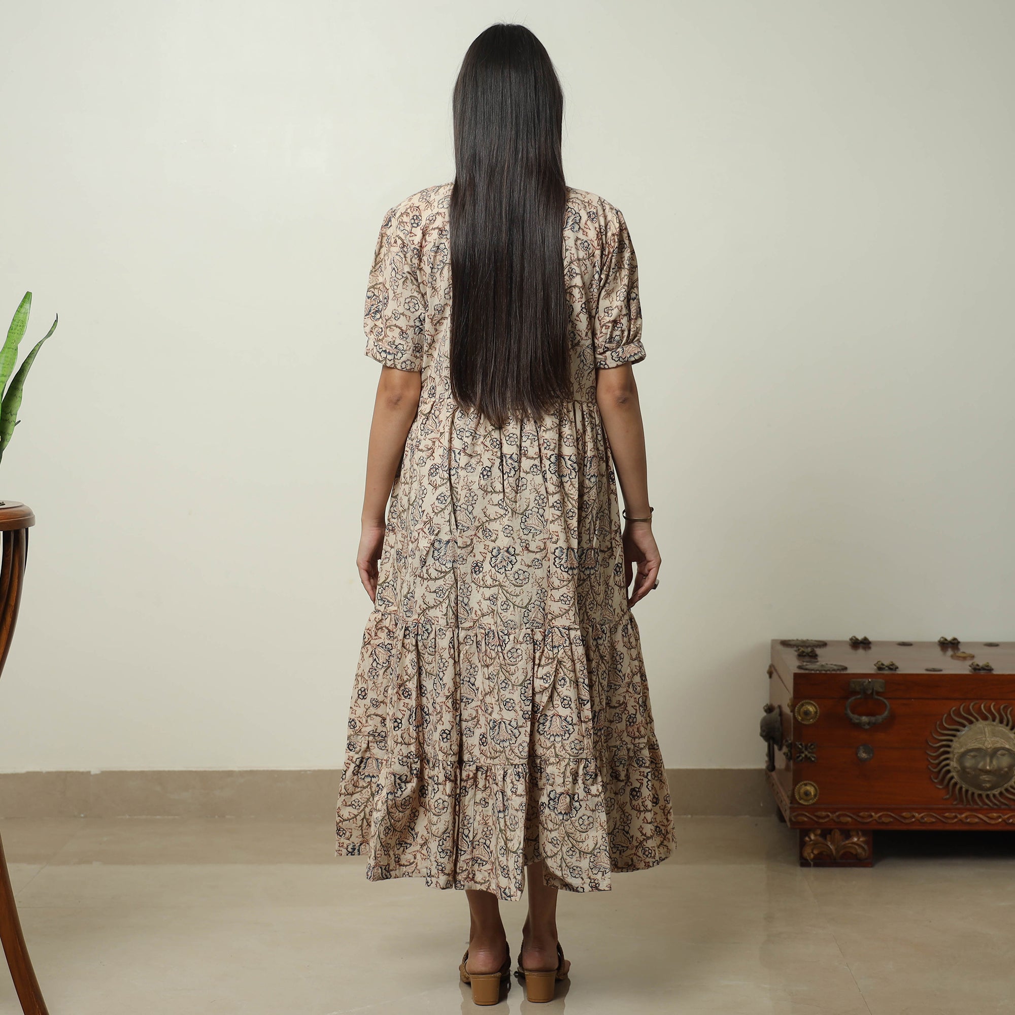 Indulge in the traditional charm of this pedana kalamkari block-printed cotton tiered dress, thoughtfully designed to enhance your style. This dress is crafted from cotton fabric, ensuring a comfortable feel against your skin.