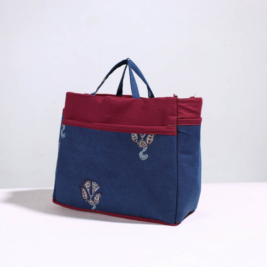 Handmade multipurpose cosmetic/toiletry bag. This bag is crafted from cotton fabric with a spill-proof plastic layer inside, textured with handmade textiles from India. It has two simple pockets, one zipper pocket inside, and four convenient pockets on the outside.