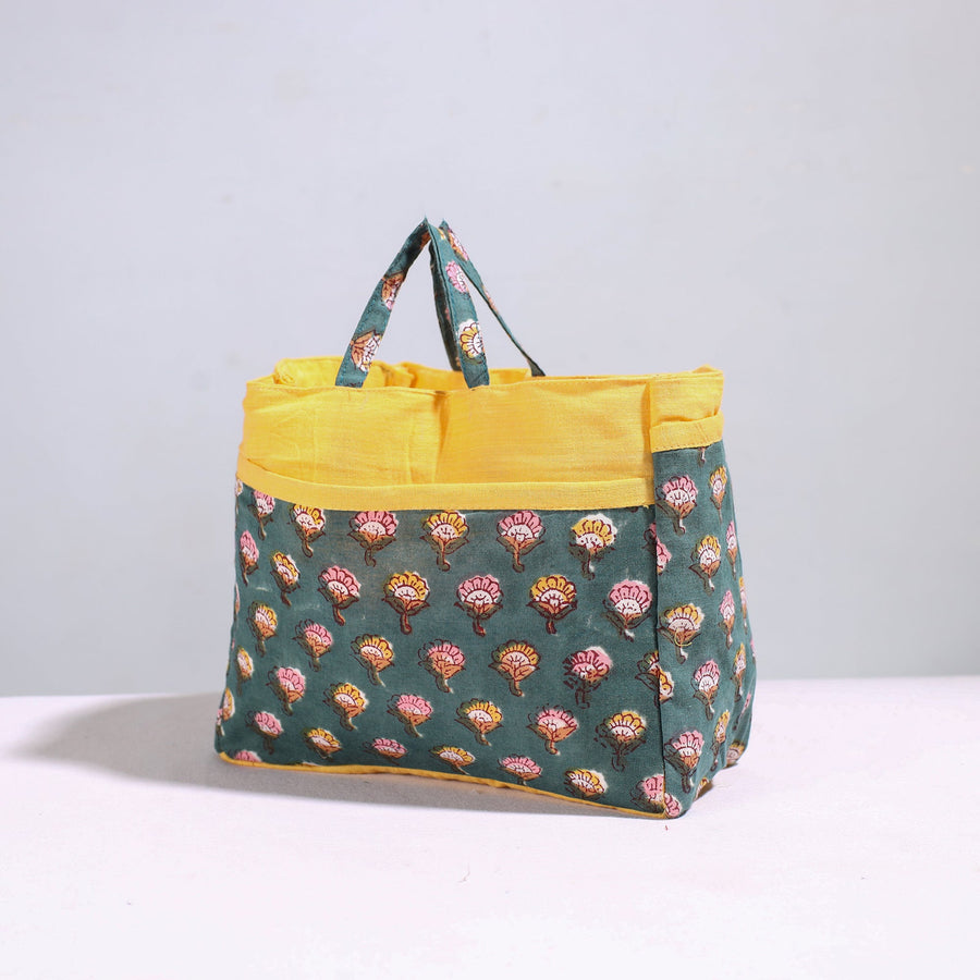 Handmade multipurpose cosmetic/toiletry bag. This bag is crafted from cotton fabric with a spill-proof plastic layer inside, textured with handmade textiles from India. It has two simple pockets, one zipper pocket inside, and four convenient pockets on the outside.