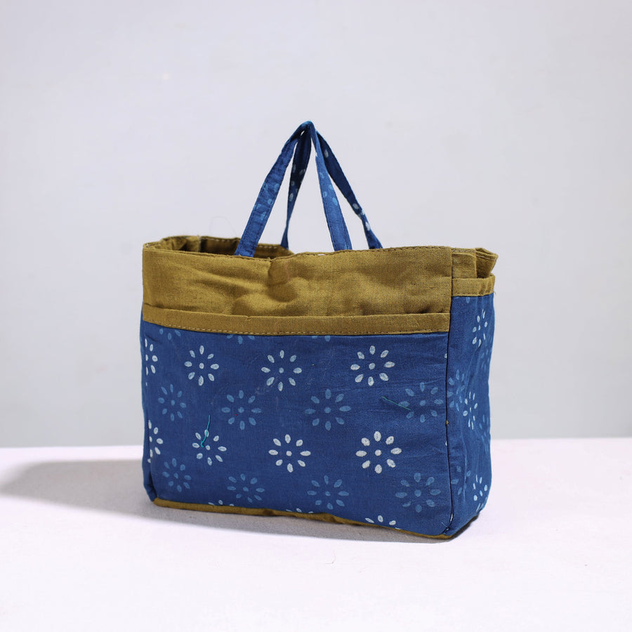 Handmade multipurpose cosmetic/toiletry bag. This bag is crafted from cotton fabric with a spill-proof plastic layer inside, textured with handmade textiles from India. It has two simple pockets, one zipper pocket inside, and four convenient pockets on the outside.