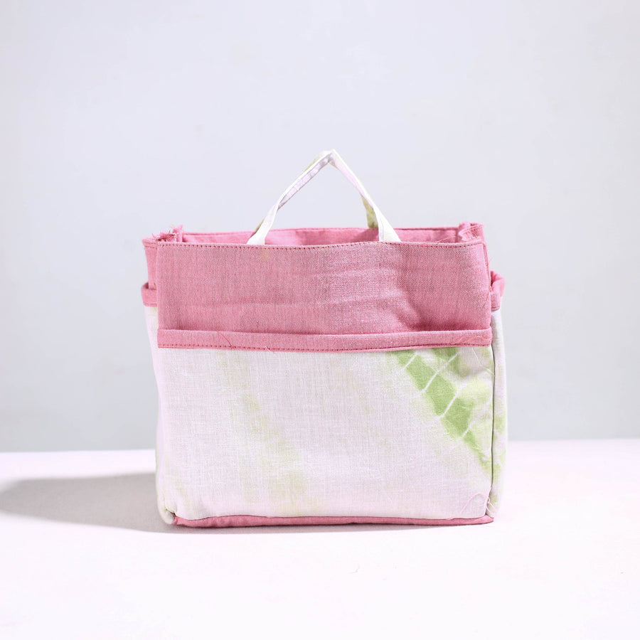 Handmade multipurpose cosmetic/toiletry bag. This bag is crafted from cotton fabric with a spill-proof plastic layer inside, textured with handmade textiles from India. It has two simple pockets, one zipper pocket inside, and four convenient pockets on the outside.
