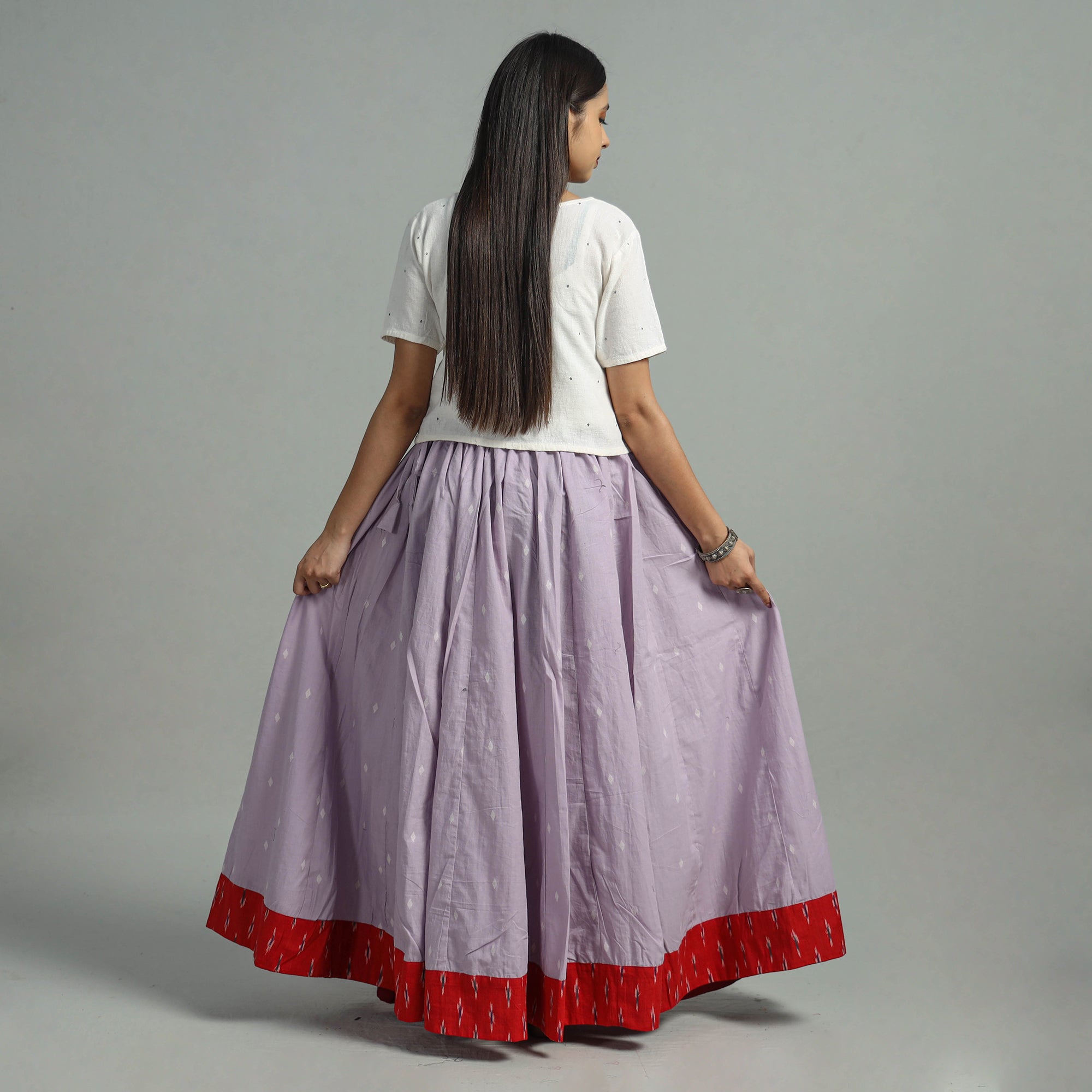 | Material | The purple jacquard patchwork 24 kali cotton long skirt features vibrant, stitched patchwork designs on cotton fabric. Crafted from jacquard weave cotton, this skirt boasts a waist tie-up closure, allowing for a customized and comfortable fit. The patchwork kali design adds a unique touch. Embrace elegance and tradition with this stunning piece. |