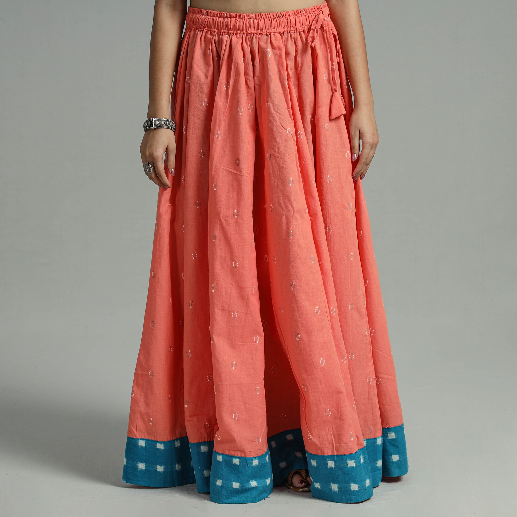 The peach jacquard patchwork 24 kali cotton long skirt features vibrant, stitched patchwork designs on cotton fabric. Crafted from jacquard weave cotton, this skirt boasts a waist tie-up closure, allowing for a customized and comfortable fit. The patchwork kali design adds a unique touch. Embrace elegance and tradition with this stunning piece.