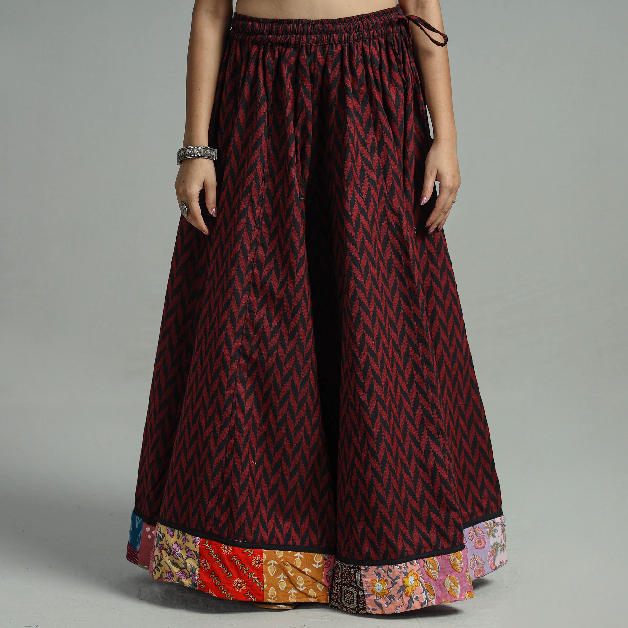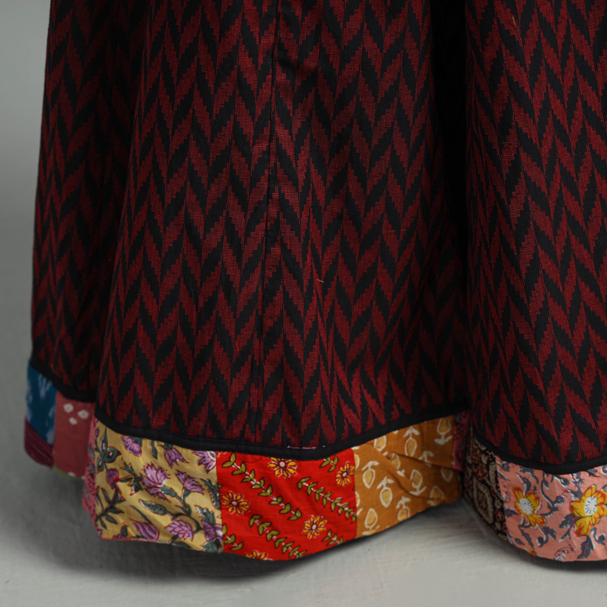 The maroon jacquard patchwork 24 kali cotton long skirt features vibrant, stitched patchwork designs on cotton fabric. Crafted from jacquard weave cotton, this skirt boasts a waist tie-up closure, allowing for a customized and comfortable fit. The patchwork kali design adds a unique touch. Embrace elegance and tradition with this stunning piece.