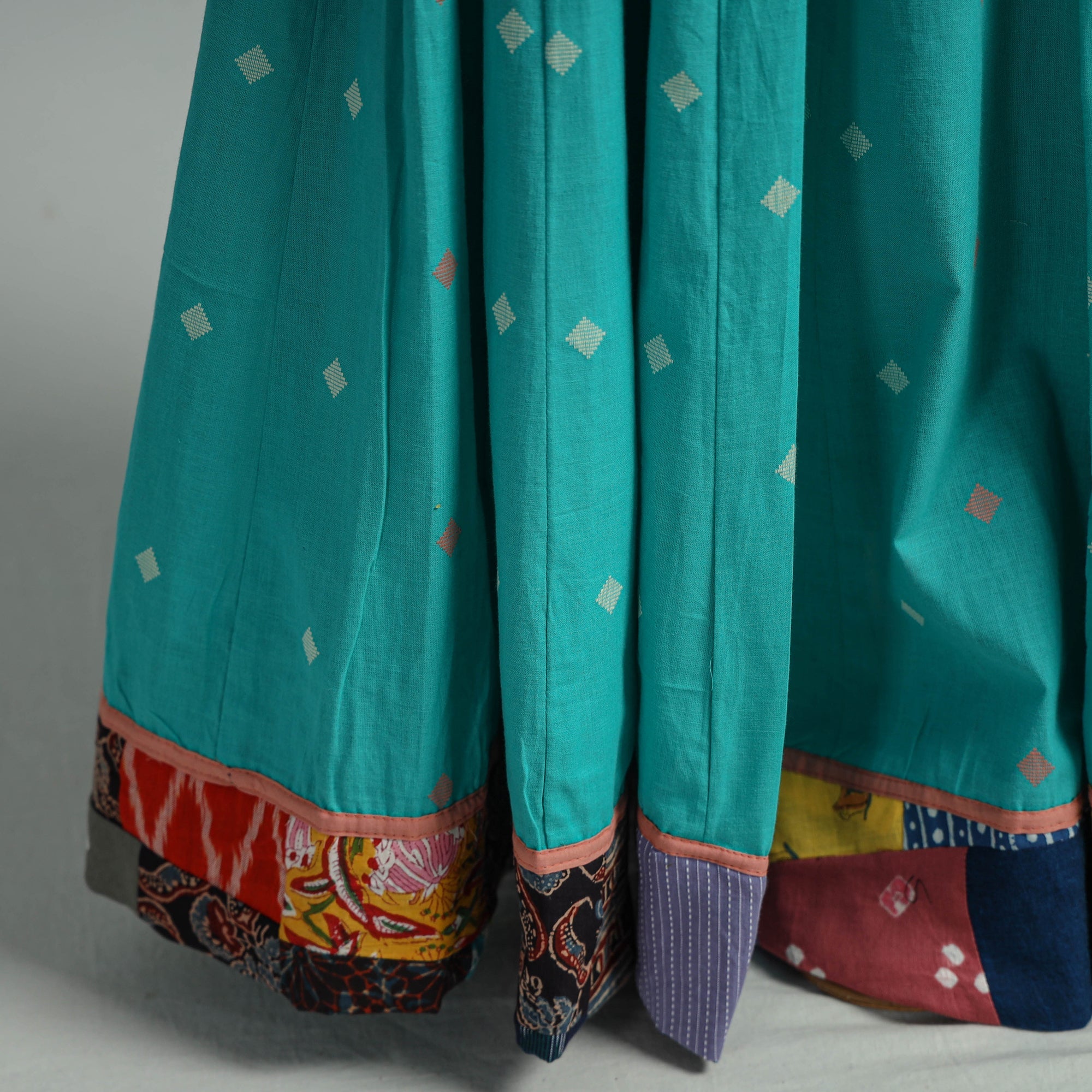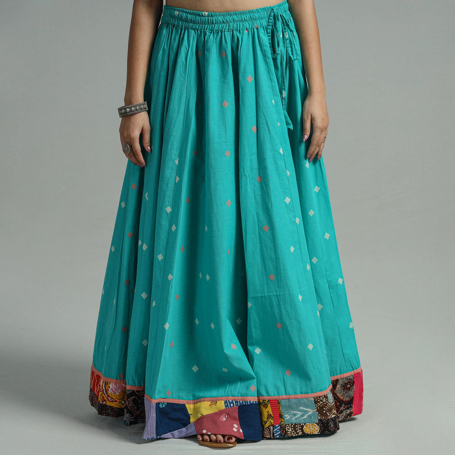 The blue jacquard patchwork 24 kali cotton long skirt features vibrant, stitched patchwork designs on cotton fabric. Crafted from jacquard weave cotton, this skirt boasts a waist tie-up closure, allowing for a customized and comfortable fit. The patchwork kali design adds a unique touch. Embrace elegance and tradition with this stunning piece.