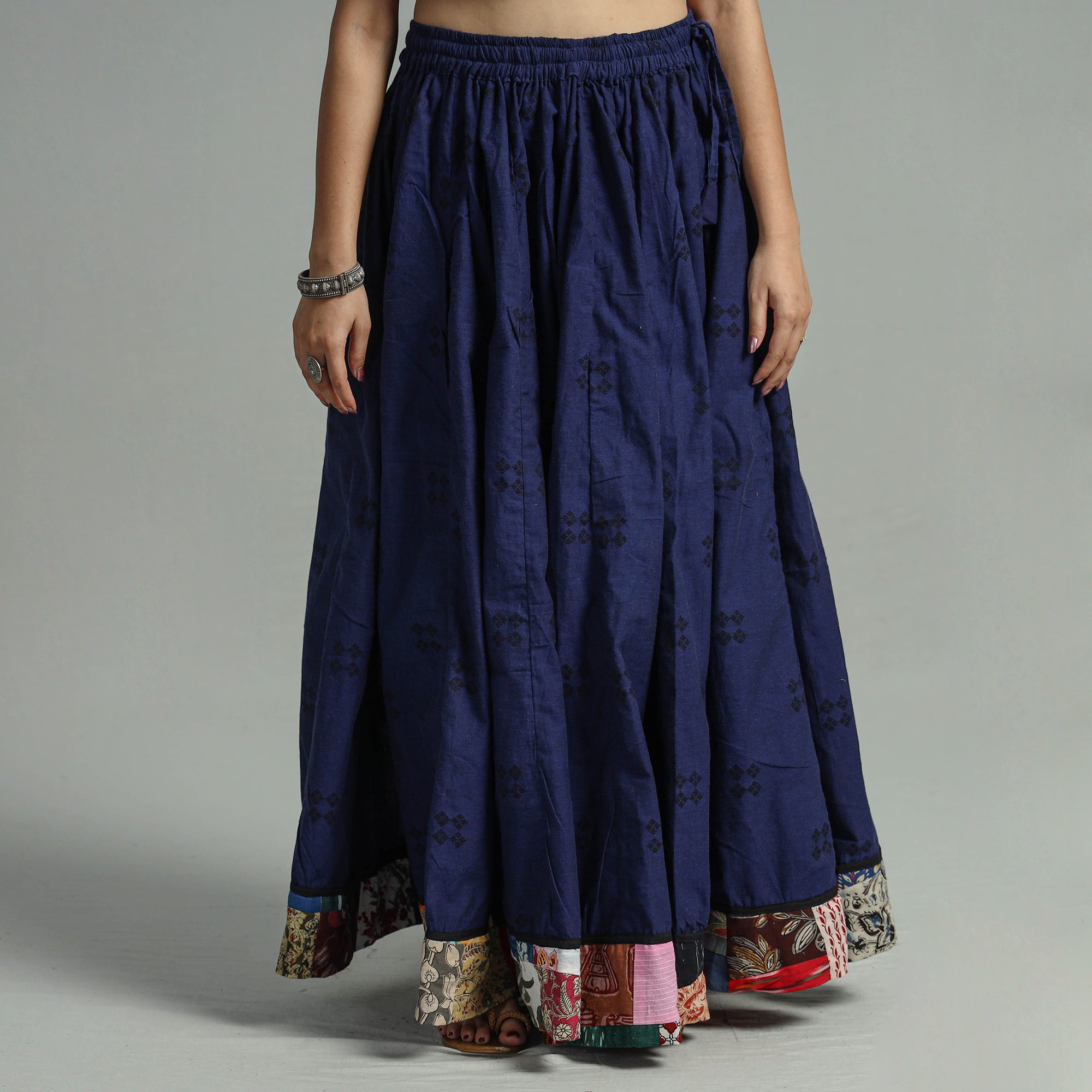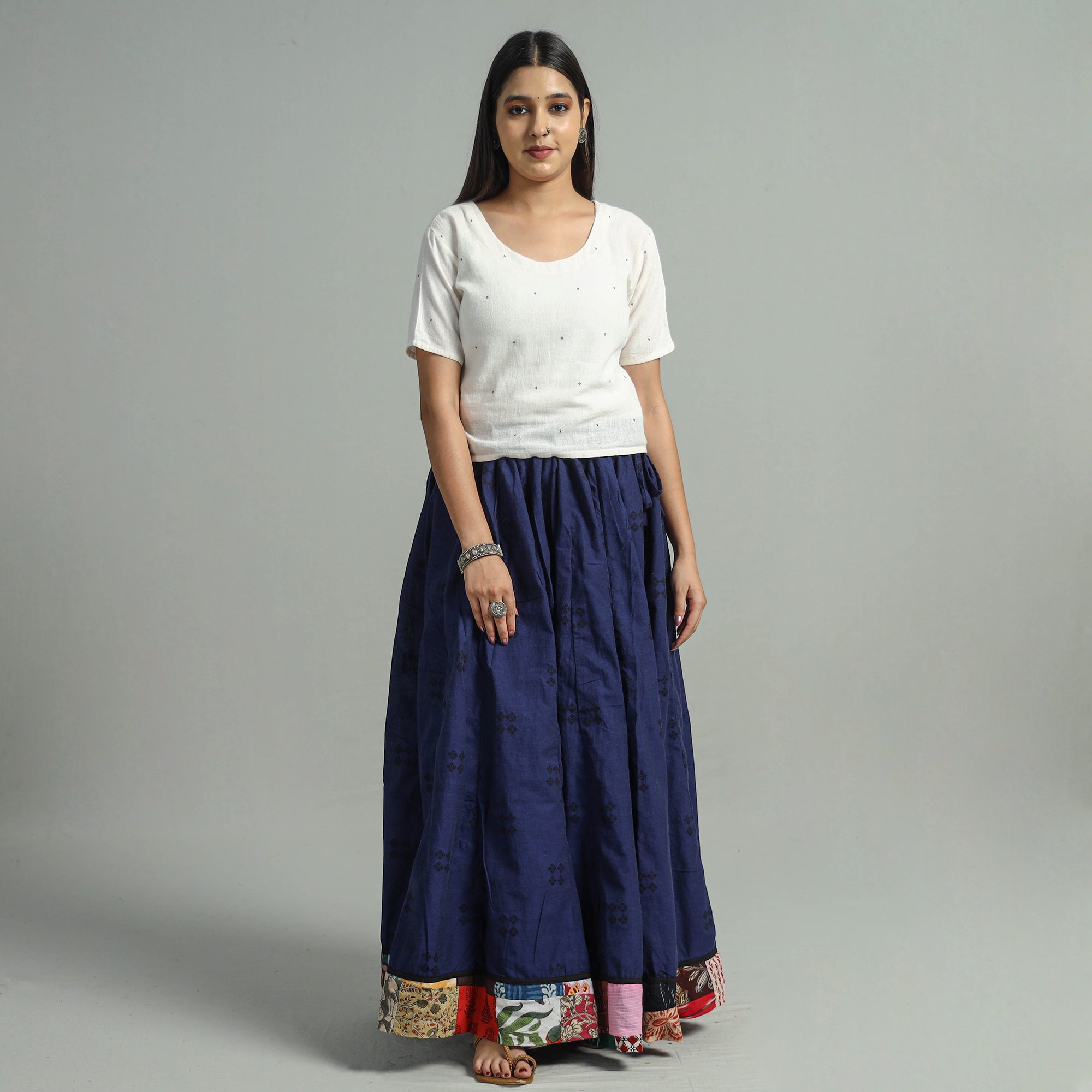 The blue jacquard patchwork 24 kali cotton long skirt features vibrant, stitched patchwork designs on cotton fabric. Crafted from jacquard weave cotton, this skirt boasts a waist tie-up closure, allowing for a customized and comfortable fit. The patchwork kali design adds a unique touch. Embrace elegance and tradition with this stunning piece.