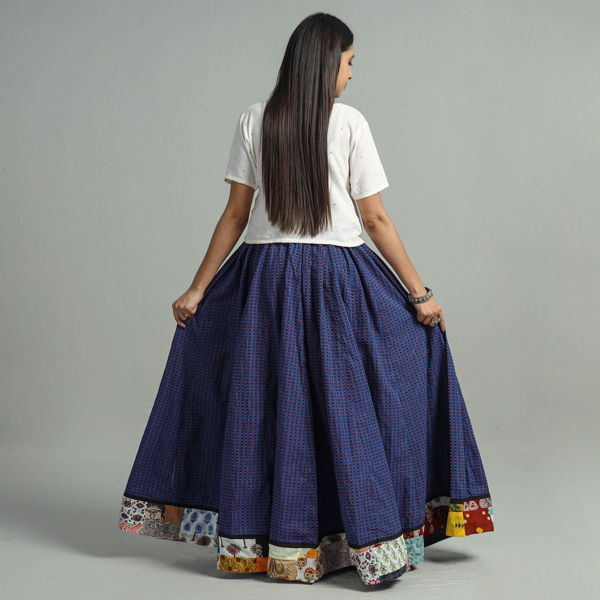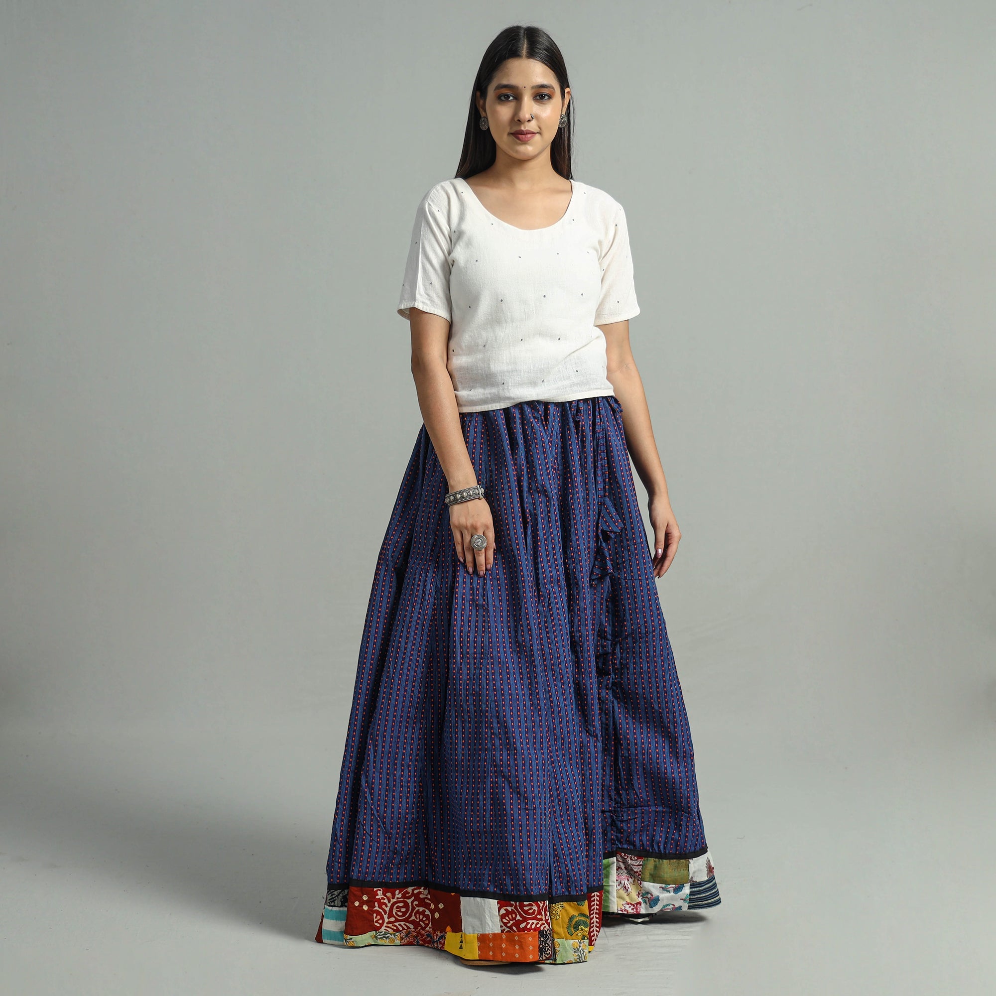 The jacquard patchwork 24 kali cotton long skirt features vibrant, stitched patchwork designs on cotton fabric. Crafted from jacquard weave cotton, this skirt boasts a waist tie-up closure, allowing for a customized and comfortable fit. The patchwork kali design adds a unique touch. Embrace elegance and tradition with this stunning piece.