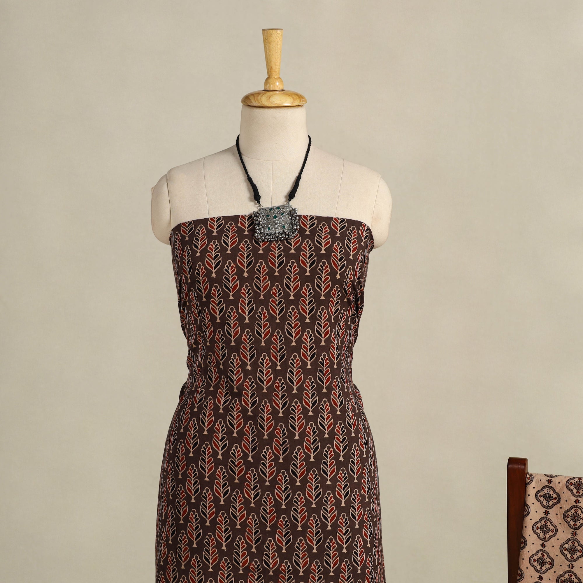 Elevate your style with the timeless beauty of this 3pc brown ajrakh hand-block-printed cotton suit material set, made using natural dyes through the traditional ajrakh technique of hand-block printing practiced by the artisans in the Kutch region of Gujarat. The intricate patterns and vibrant colors on the cotton fabric create a perfect blend of elegance and comfort, making it ideal for any special occasion.