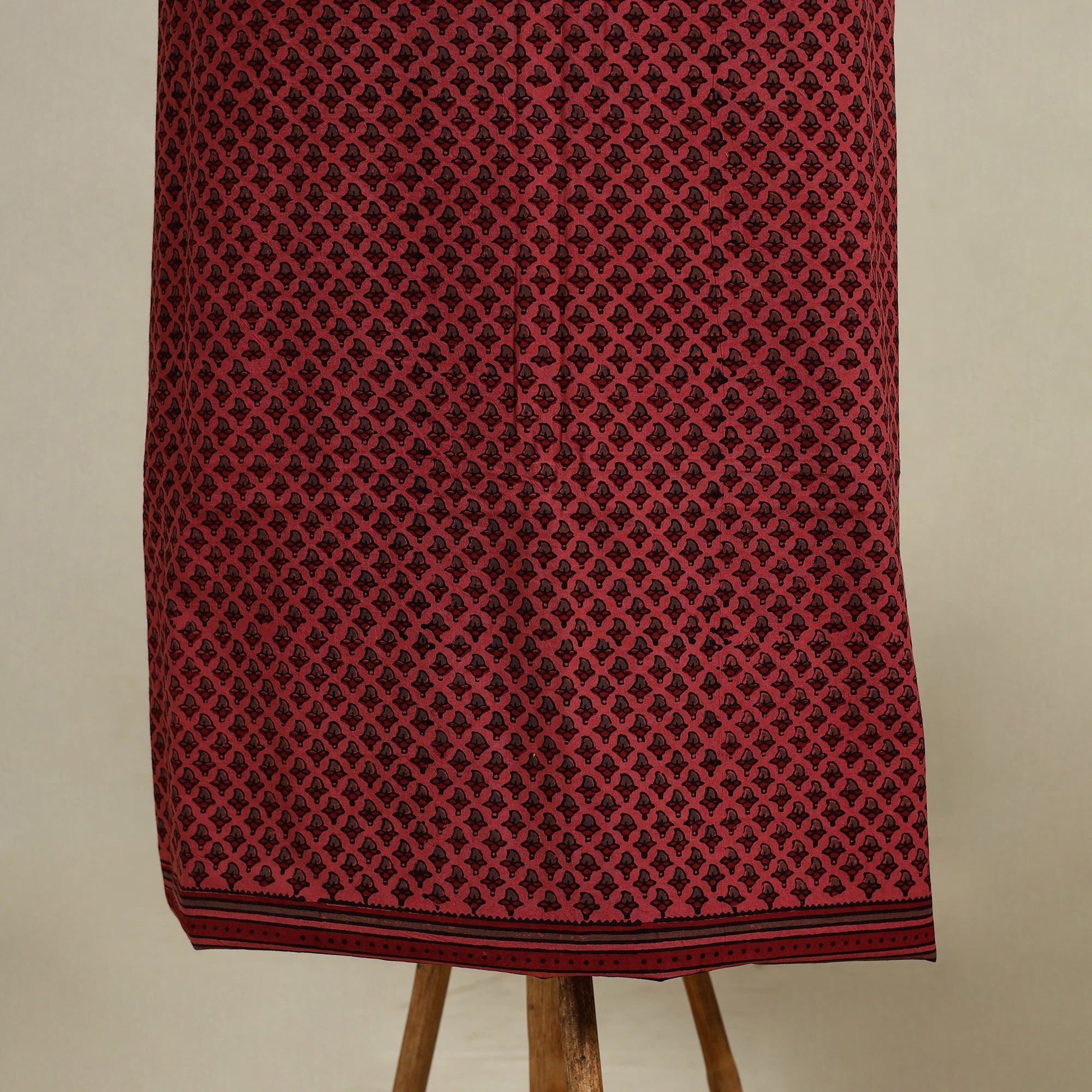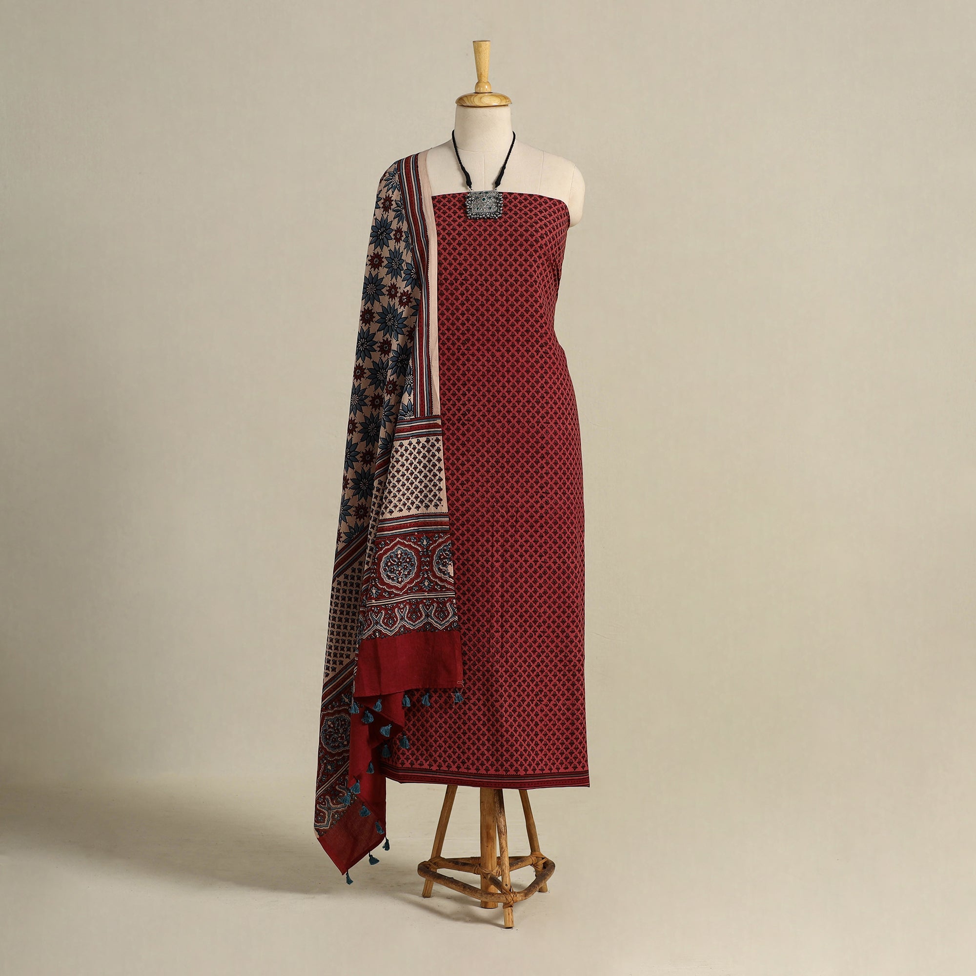 Elevate your style with the timeless beauty of this 3pc red ajrakh hand-block-printed cotton suit material set, made using natural dyes through the traditional ajrakh technique of hand-block printing practiced by the artisans in the Kutch region of Gujarat. The intricate patterns and vibrant colors on the cotton fabric create a perfect blend of elegance and comfort, making it ideal for any special occasion.