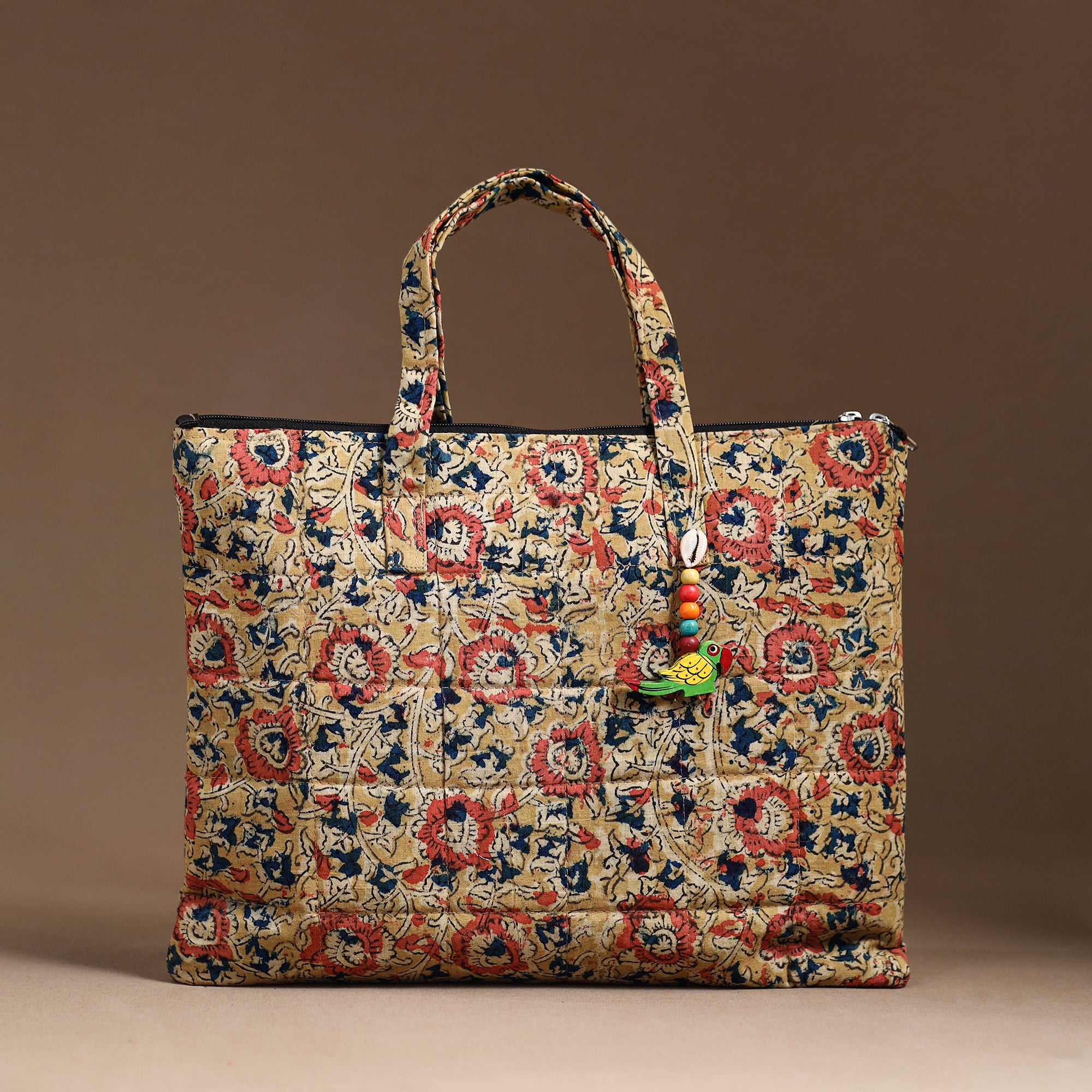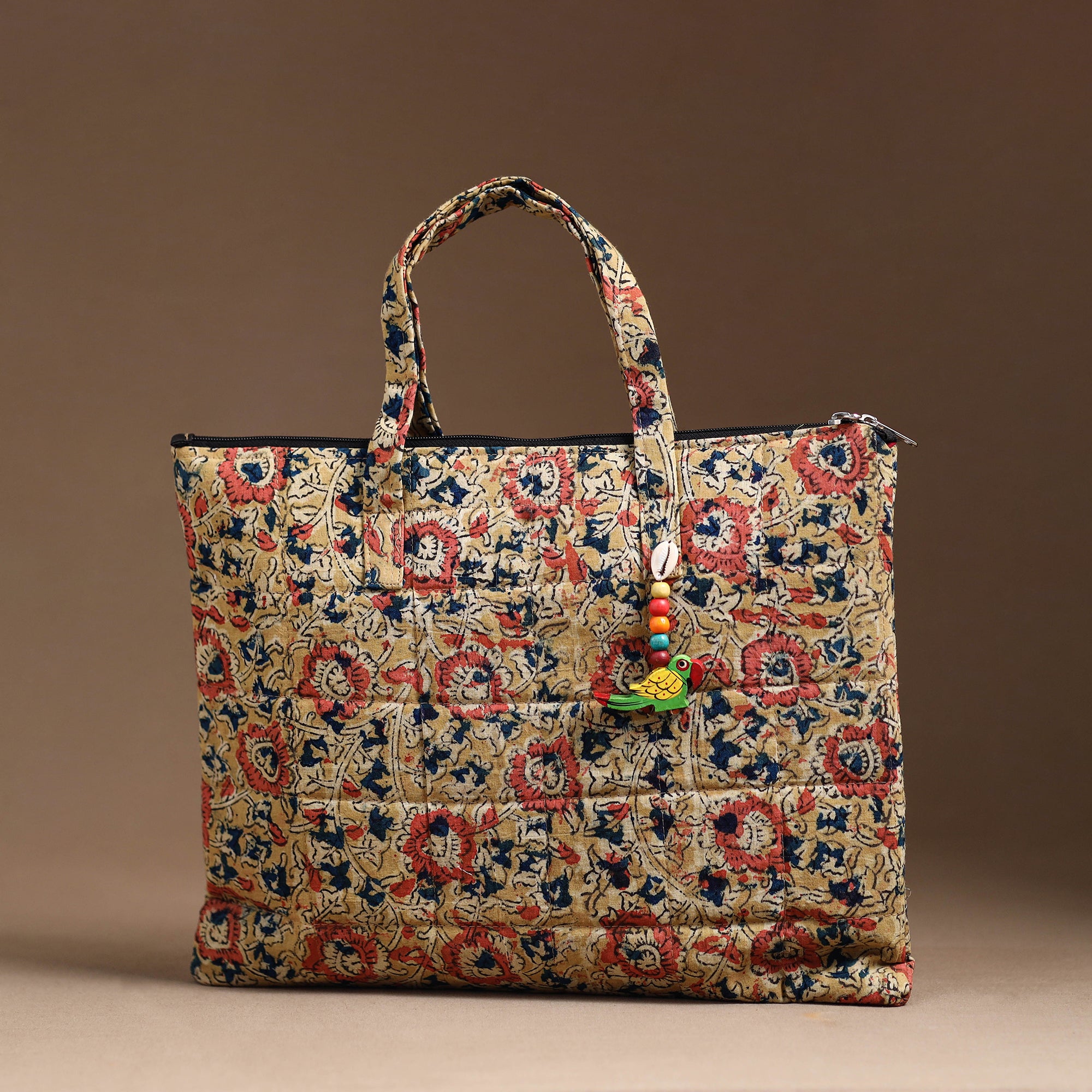 This beige hand bag is made from handcrafted quilted cotton fabric. This hand bag with a zip-lock main closure, providing ample space for your essentials. The foam layer lining ensures durability and protection. Enhance your style with this unique, functional accessory.