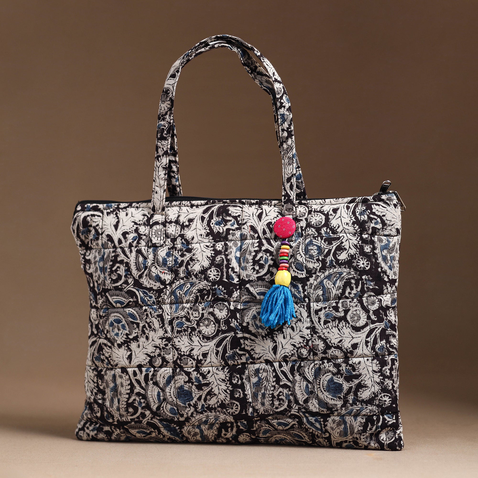 This black hand bag is made from handcrafted quilted cotton fabric. This hand bag with a zip-lock main closure, providing ample space for your essentials. The foam layer lining ensures durability and protection. Enhance your style with this unique, functional accessory.