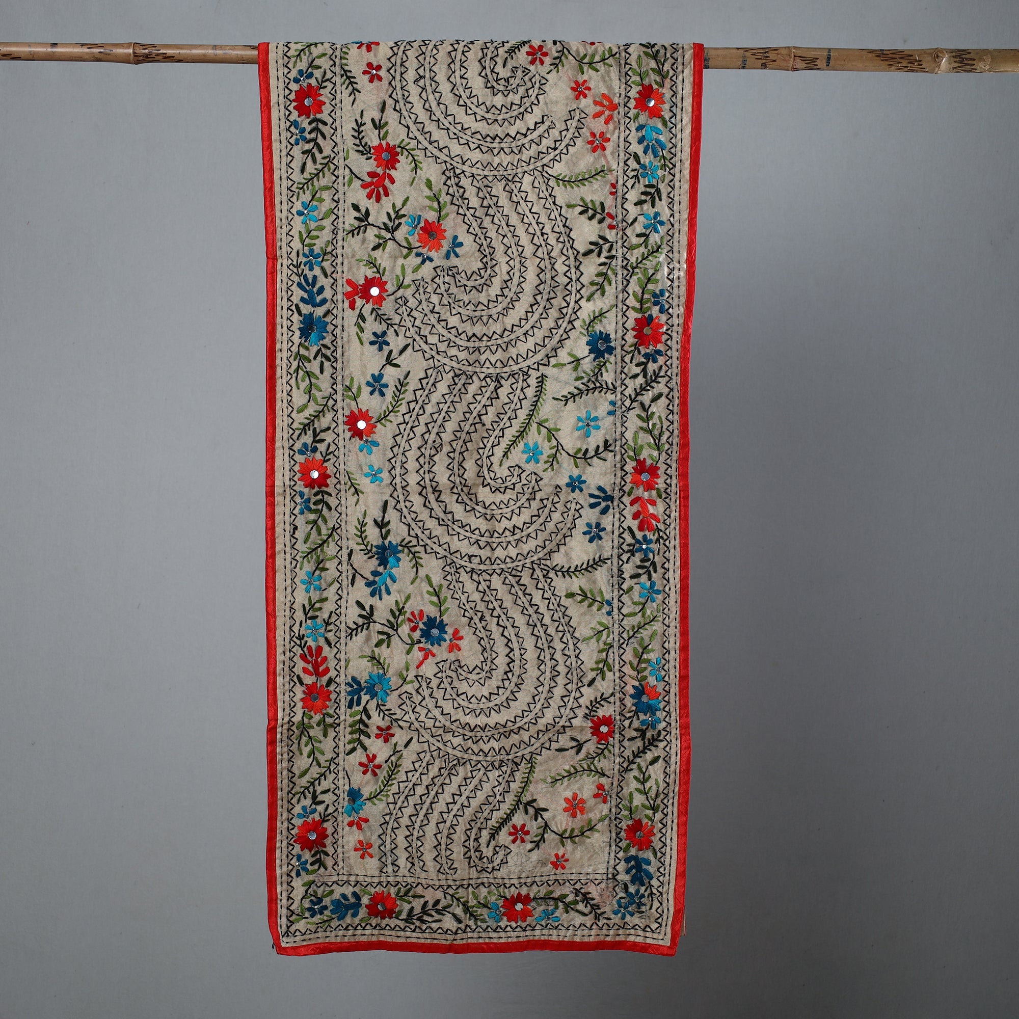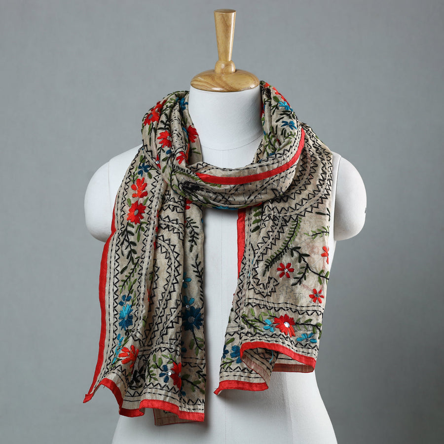 Enhance your ensemble with the red ranihati chapa work embroidery chanderi silk stole. This beautiful stole is designed with traditional patterns and has been hand-embroidered by skilled craftspeople from Ranihati, Howrah, West Bengal.