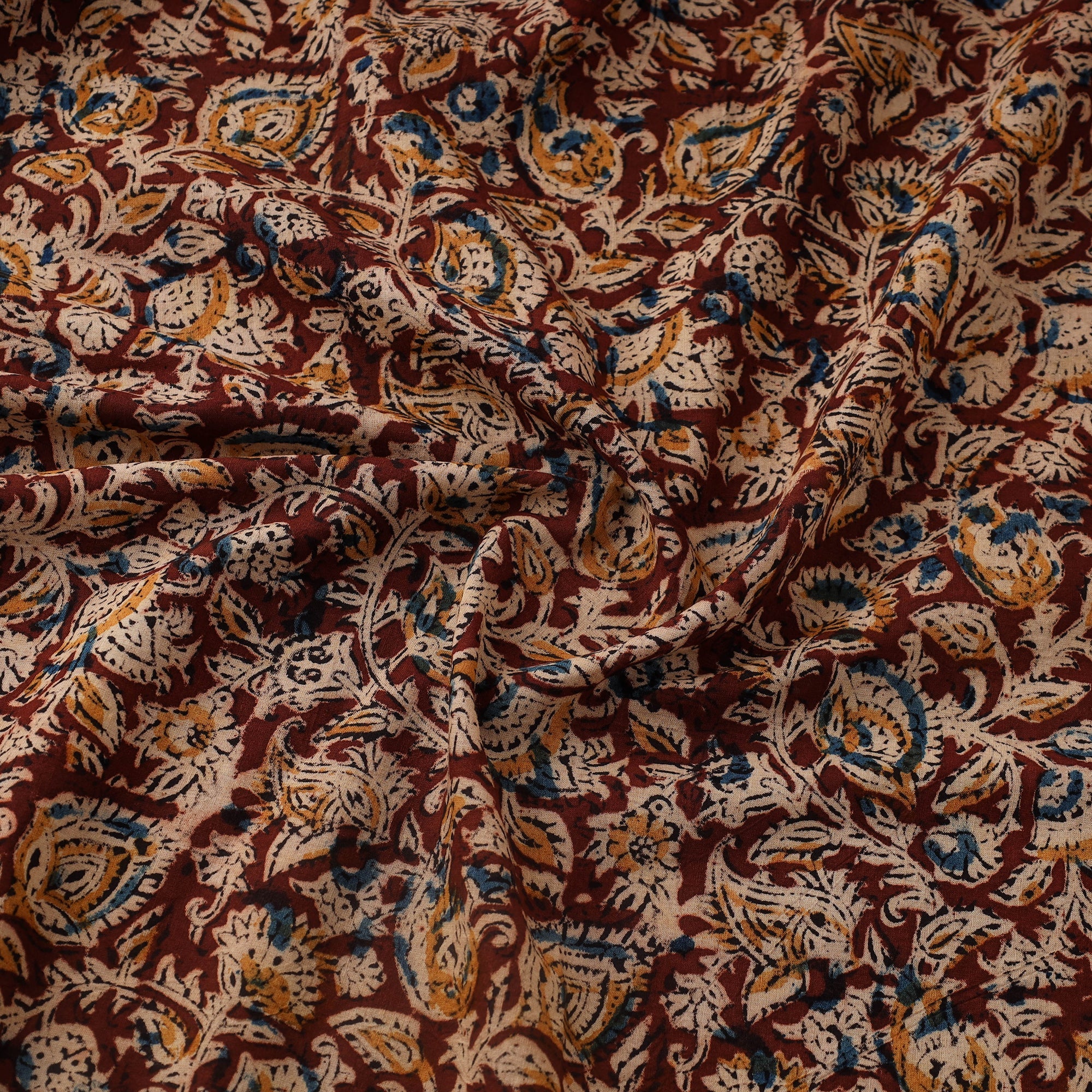 Indulge in the rich artistry of maroon pedana kalamkari with this fine-quality cotton fabric. Hand-block printed using natural dyes, this fabric showcases an array of traditional motifs inspired by Kalamkari painting. The intricate detailing and complex techniques used by artisans from Andhra Pradesh make this fabric a masterpiece.