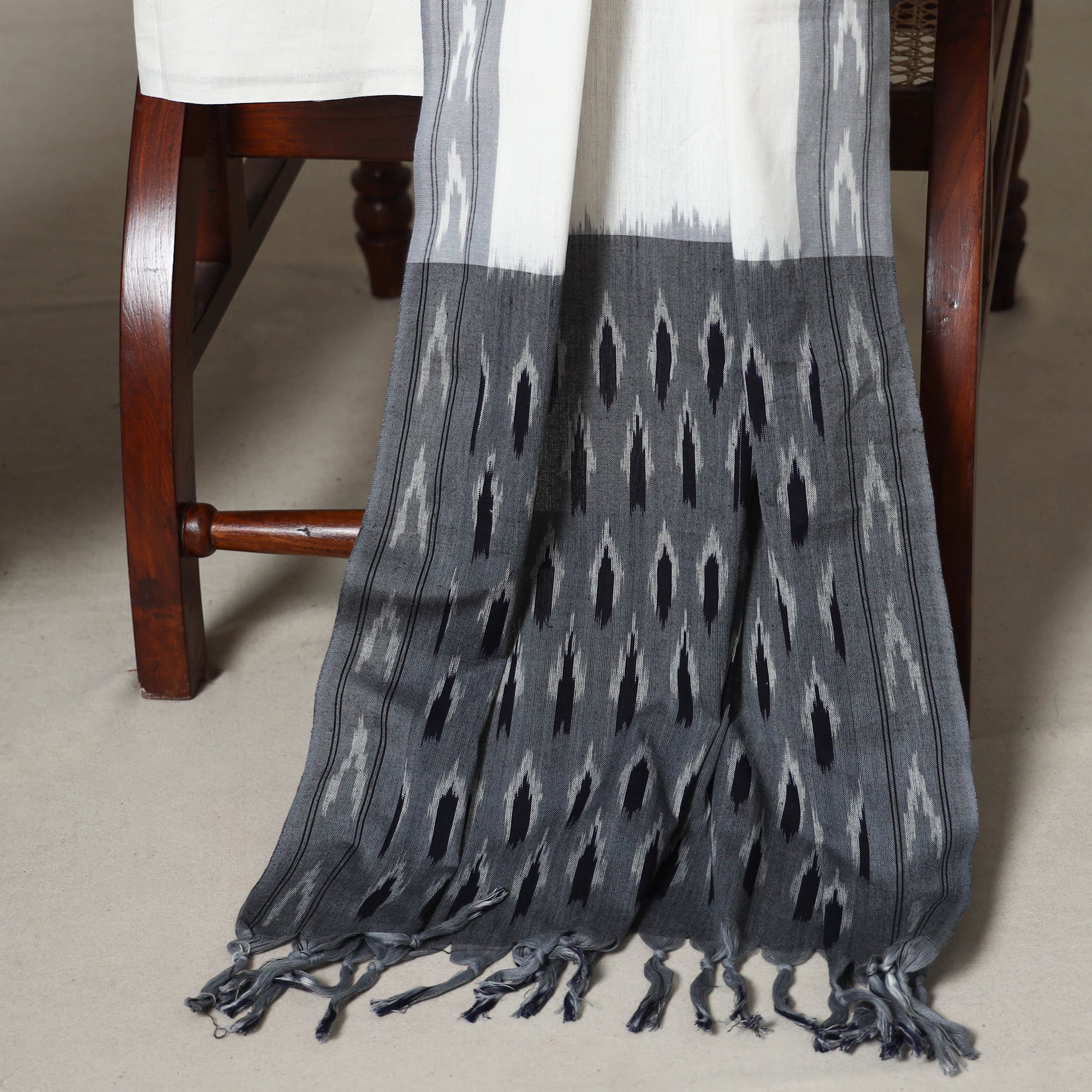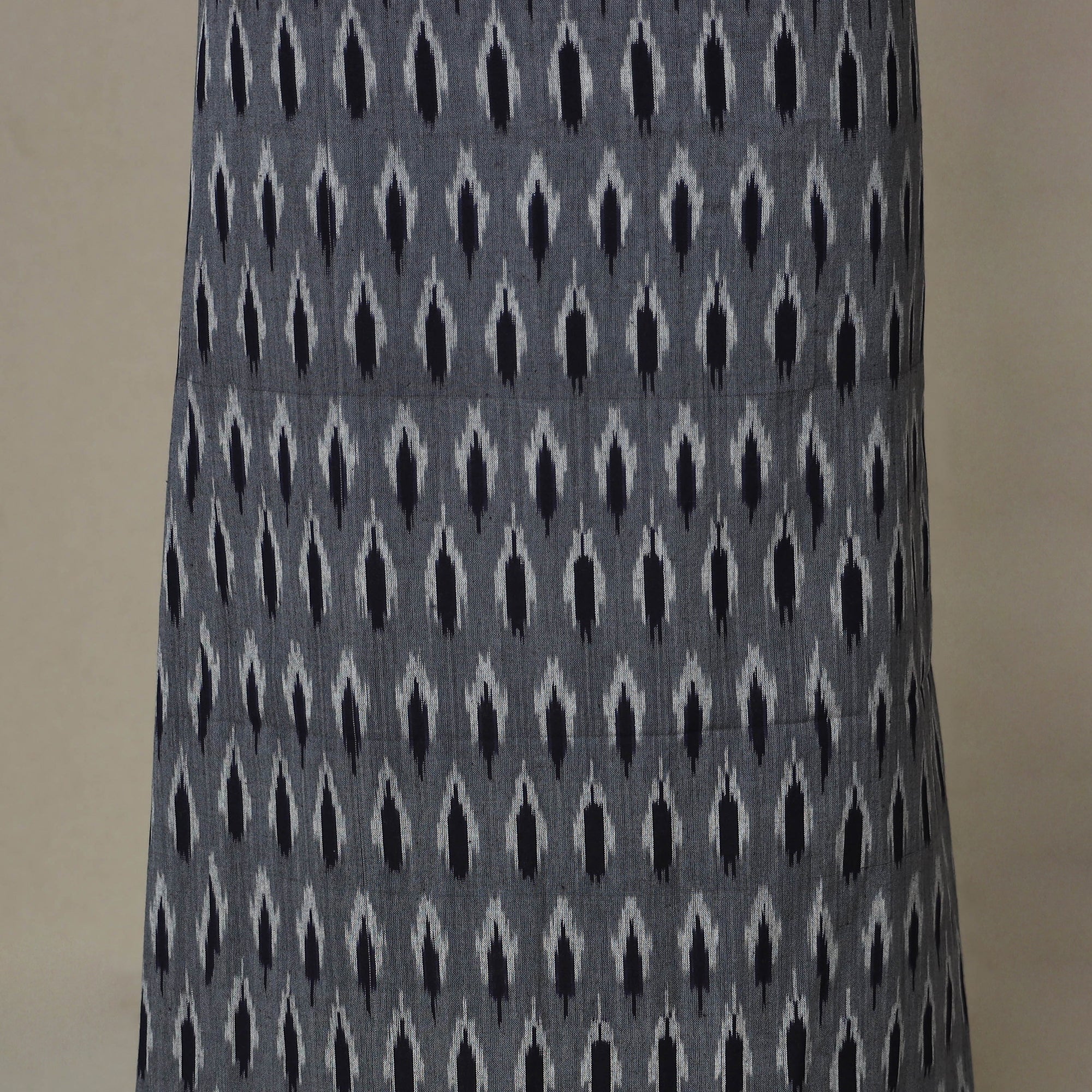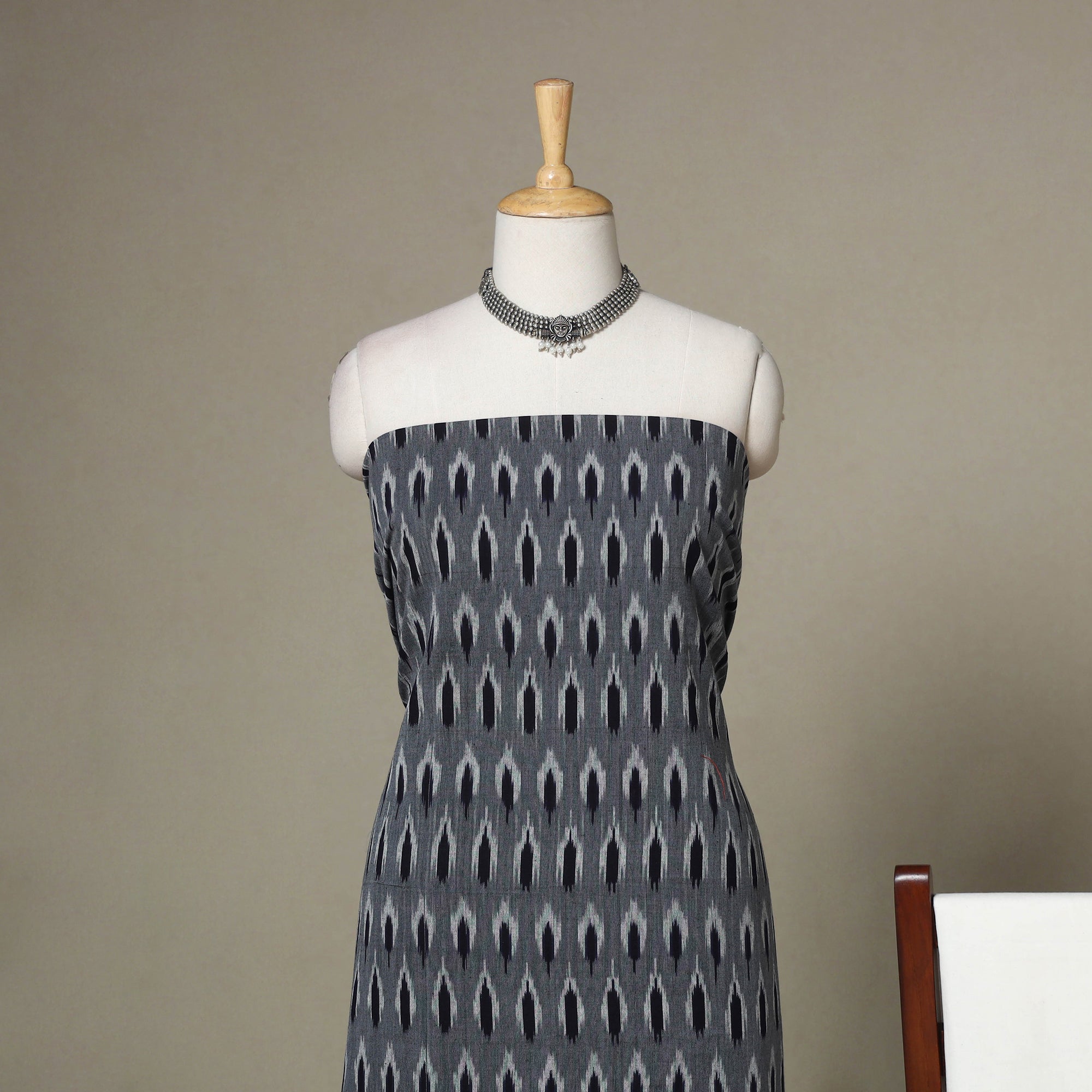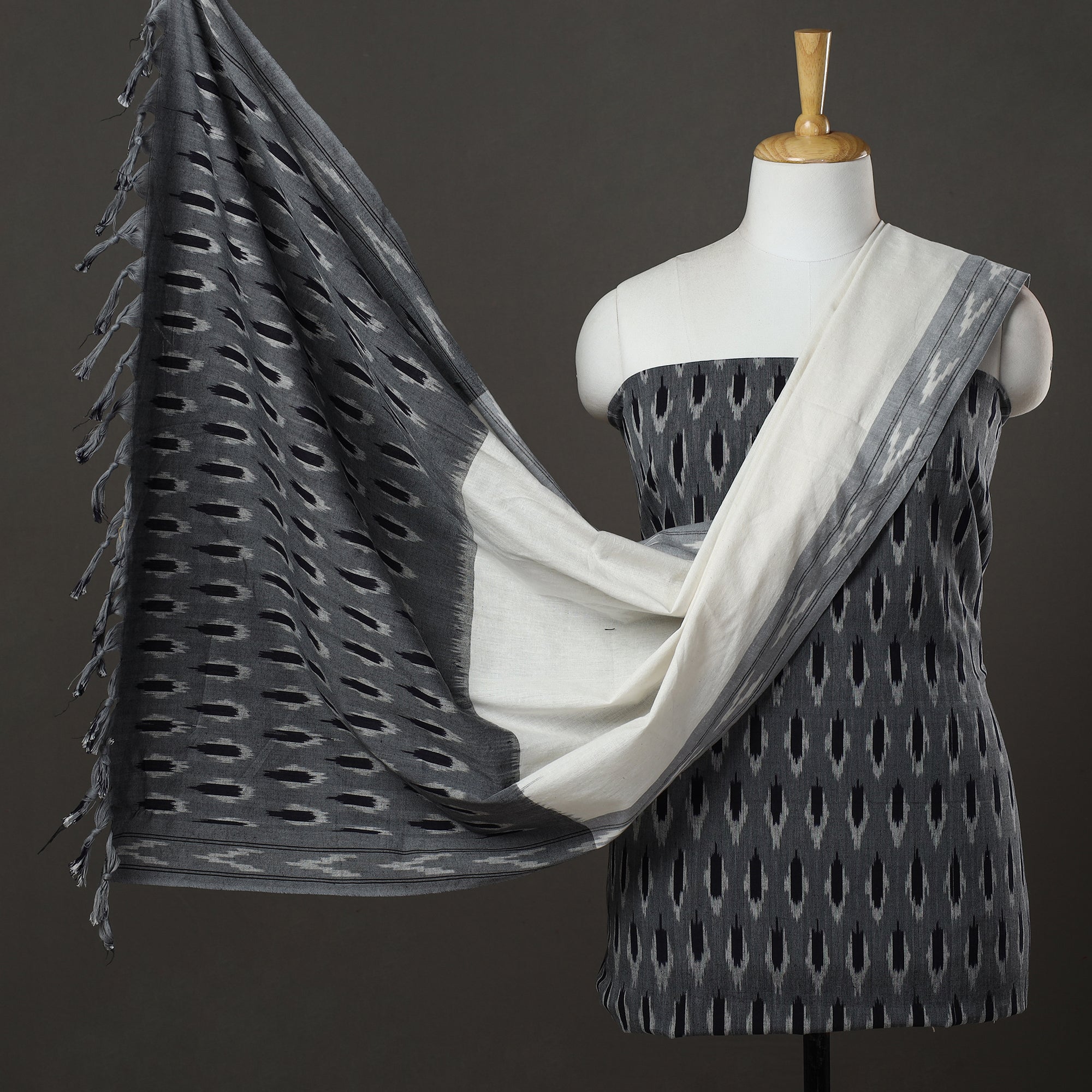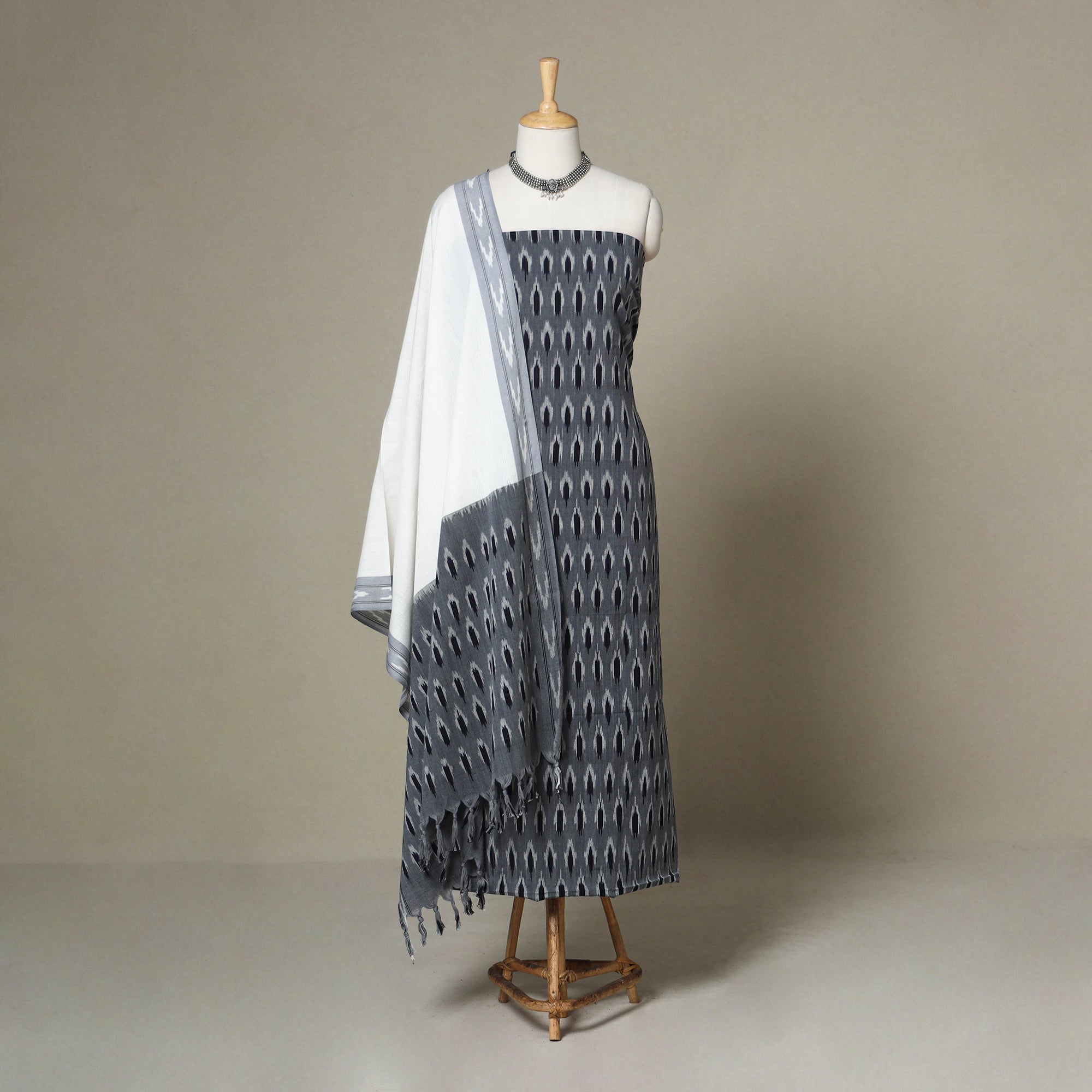 This fine-quality grey pochampally ikat weave handloom cotton 3-piece suit material set from Telangana features world-famous patterns and colors. Ikat is known for its beautiful designs and texture, and Indian Ikat is particularly admired by fashion designers worldwide. The set includes a top/kurta with a lovely Ikat pattern, a matching plain-color bottom/salwar piece, and an ikat dupatta.