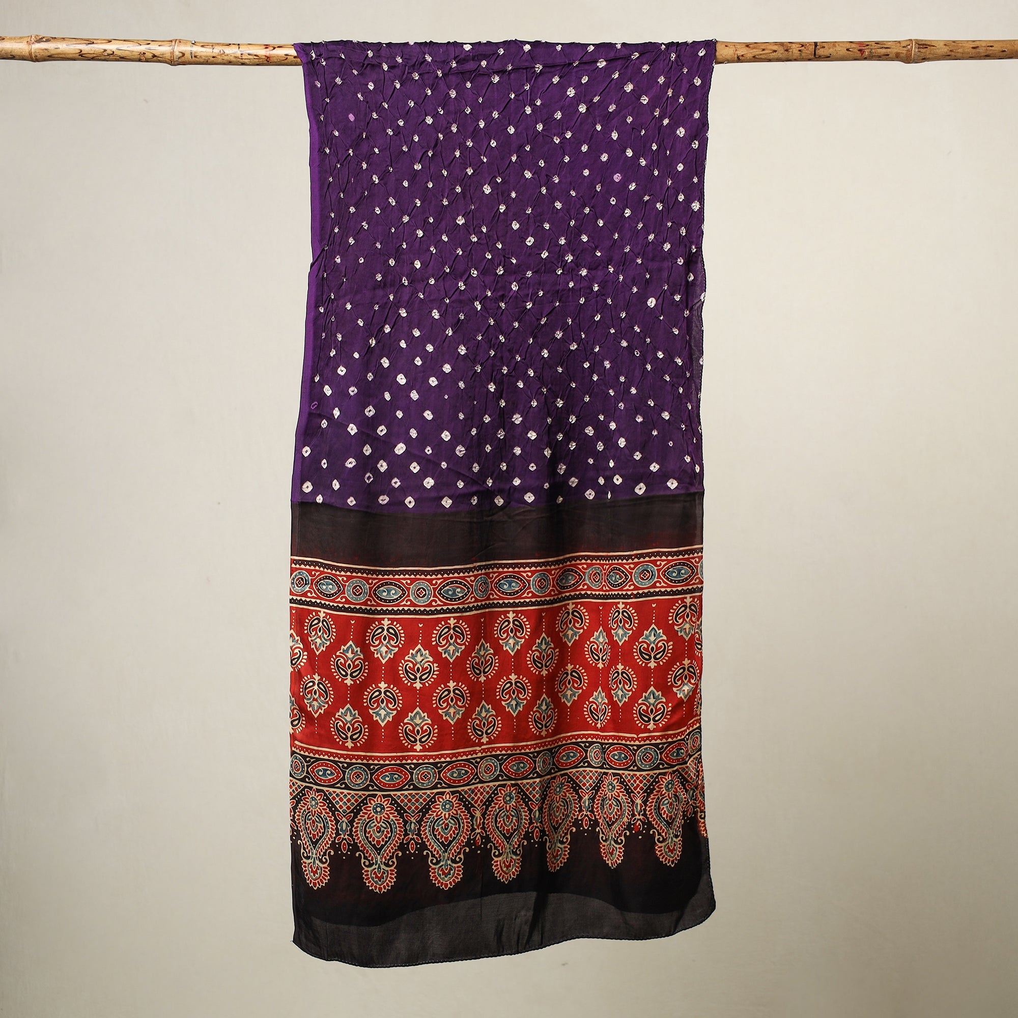 This purple bandhani tie-dye ajrakh block-printed stole is crafted from luxurious modal silk, a fabric known for its softness and lustrous sheen. This stole beautifully merges the artistic techniques of bandhani and ajrakh, presenting a seamless blend of tradition.