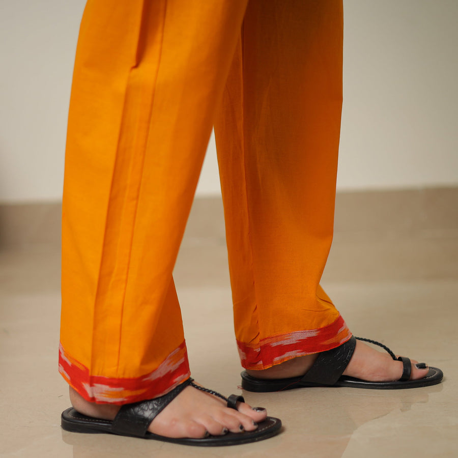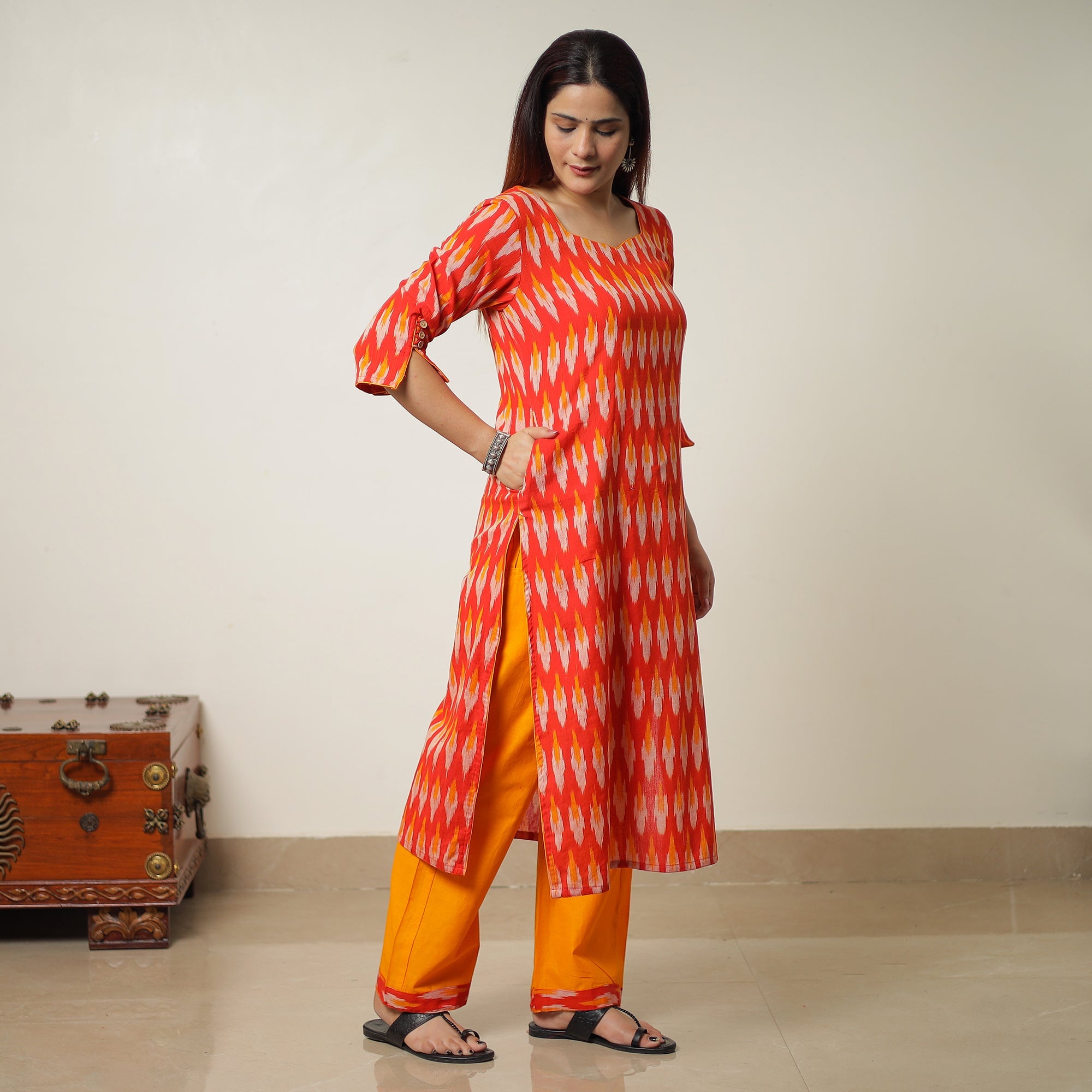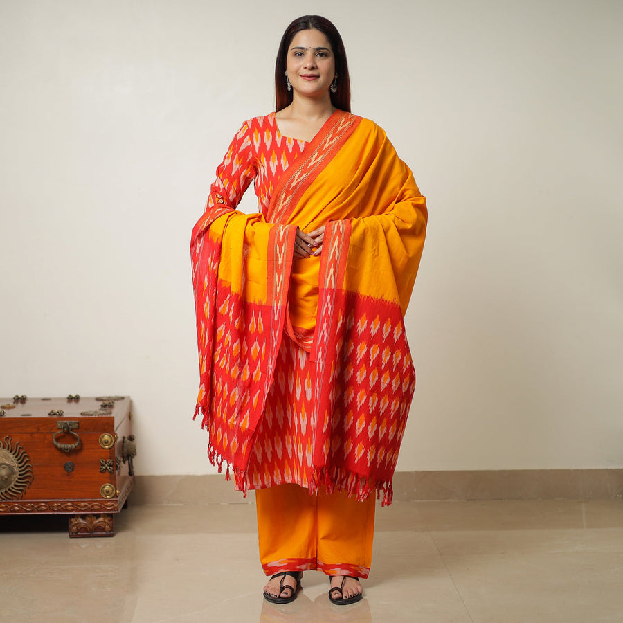 This pochampally ikat weave cotton stitched kurta with palazzo & dupatta set is the perfect blend of comfort and style. This suit set is made of cotton fabric, ensuring a comfortable feel against your skin. The kurta also features a convenient one-side pocket, perfect for carrying small essentials, and the palazzo features an elasticized waist and two side pockets, adding functionality to this palazzo.