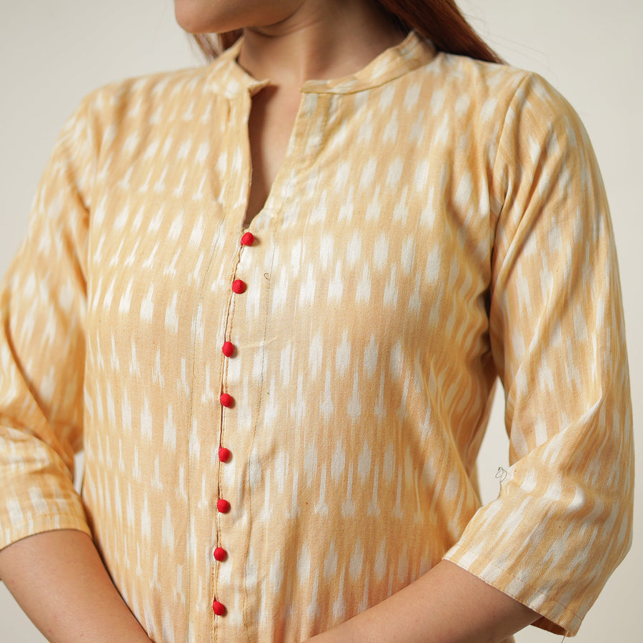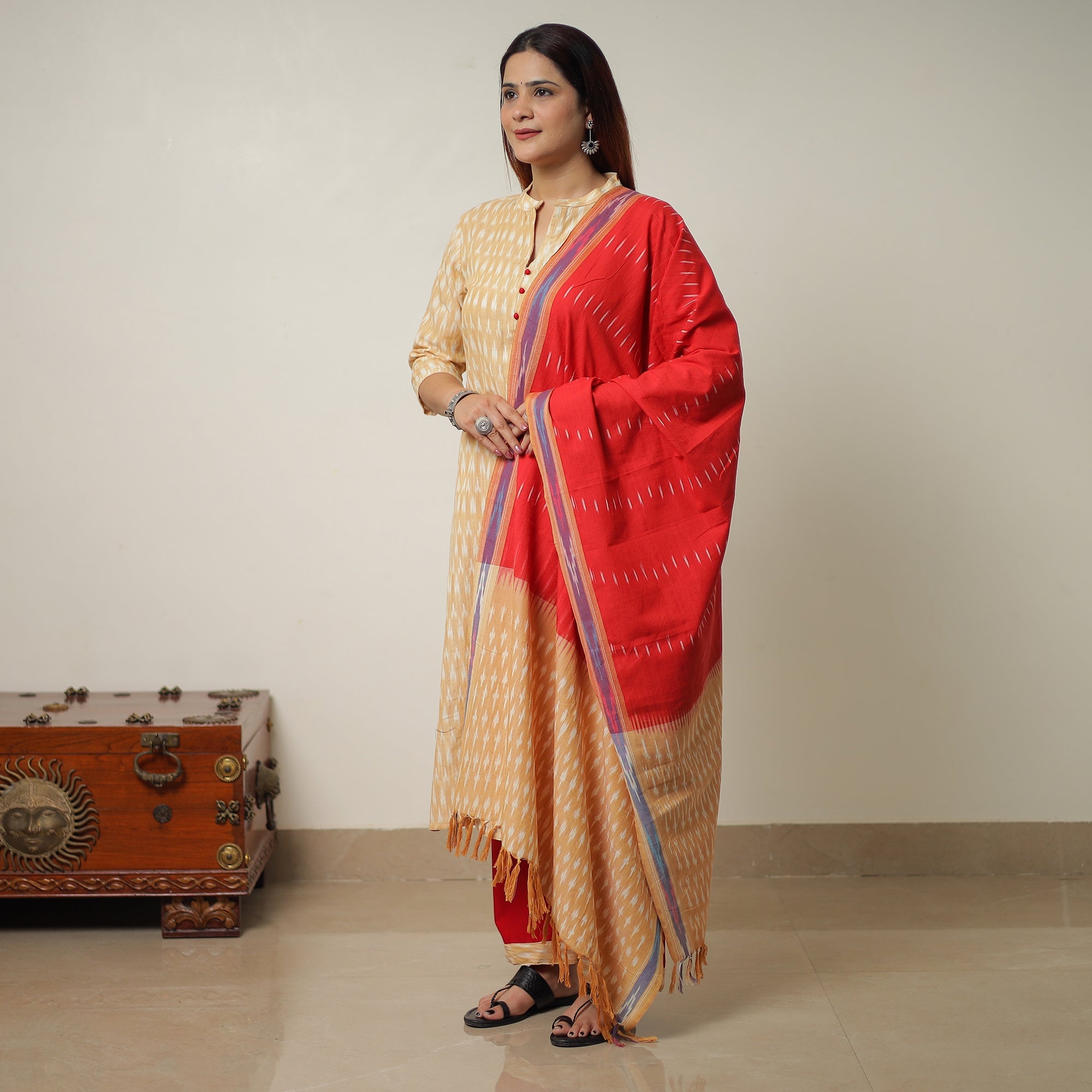 This beige pochampally ikat weave cotton stitched kurta with palazzo & dupatta set is the perfect blend of comfort and style. This suit set is made of cotton fabric, ensuring a comfortable feel against your skin. The kurta also features a convenient one-side pocket, perfect for carrying small essentials, and the palazzo features an elasticized waist and two side pockets, adding functionality to this palazzo.