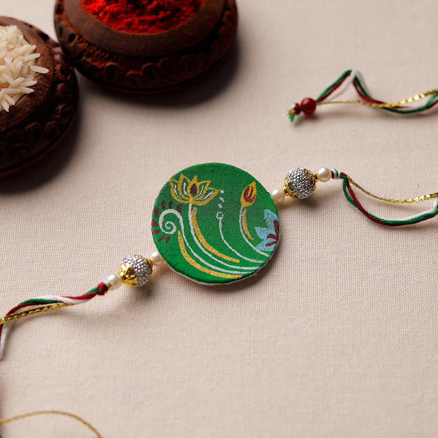 | Material | Celebrate the bond of love and affection with our exquisite Bishnupur handpainted fabric rakhi. Addornal with beads, shells, and kundan Each rakhi is a masterpiece, meticulously handcrafted by skilled artisans from Bishnupur, West Bengal, renowned for their intricate handpainting techniques. By purchasing Rakhi from iTokri, you have proudly associated yourself with our artisan support initiative, which brings happiness to more than 10,000 families across India. Thanks so much! |