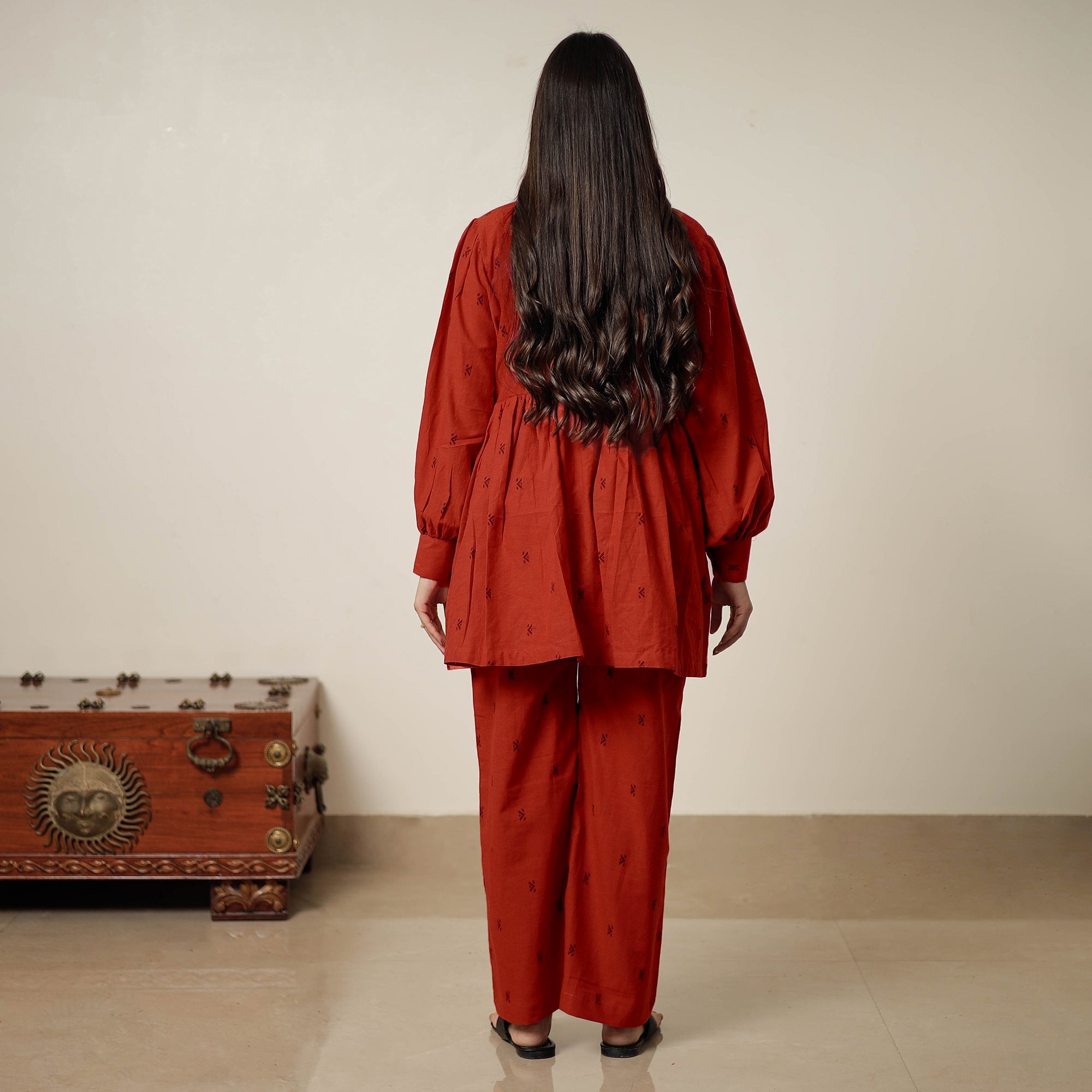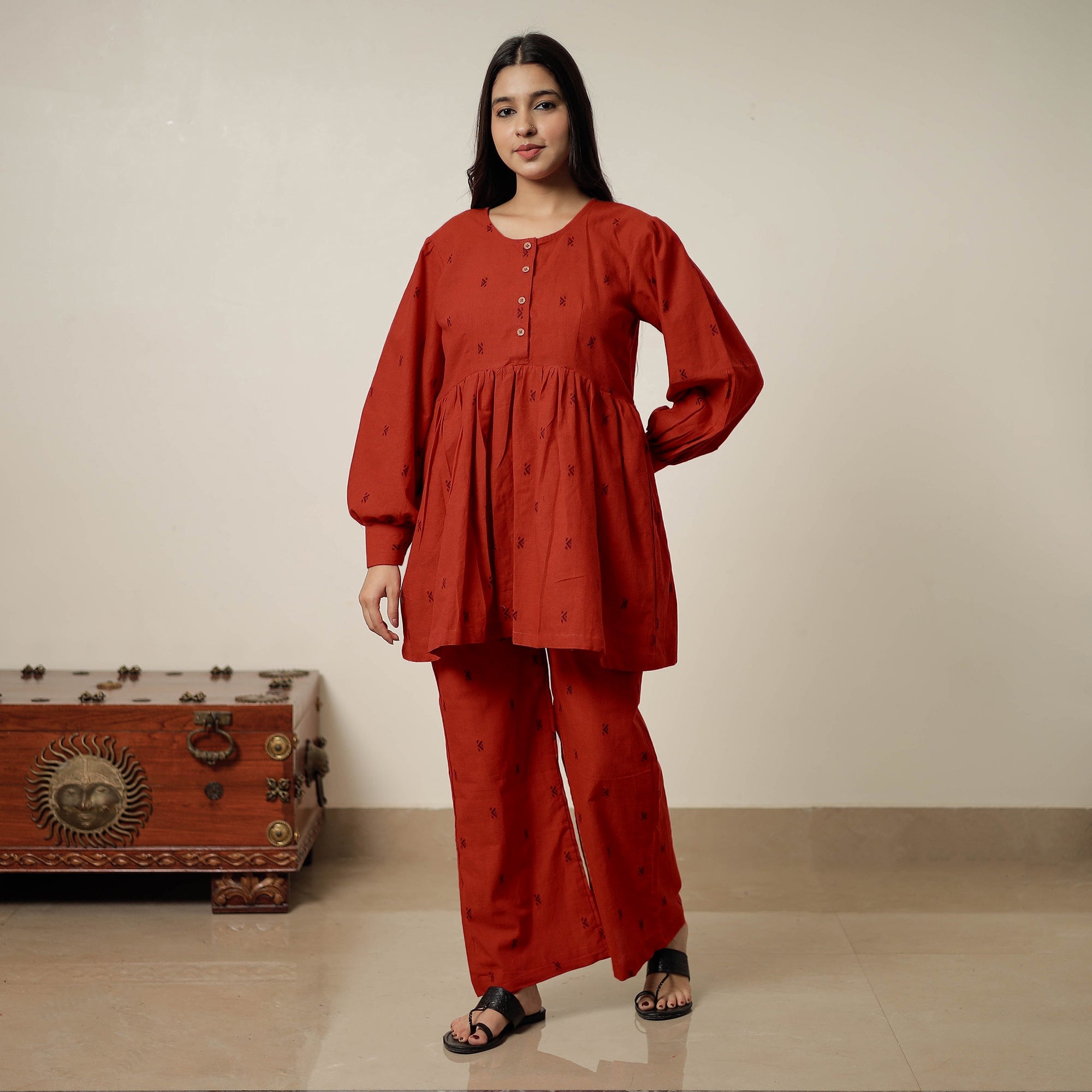 Stay comfortable and stylish in this cotton top and pant co-ord set. Made from jacquard prewashed cotton fabric. The elasticized waist pant ensures a great fit, while the two side pockets adds functionality to this pant. The unique design ensures a beautiful and comfortable fit.