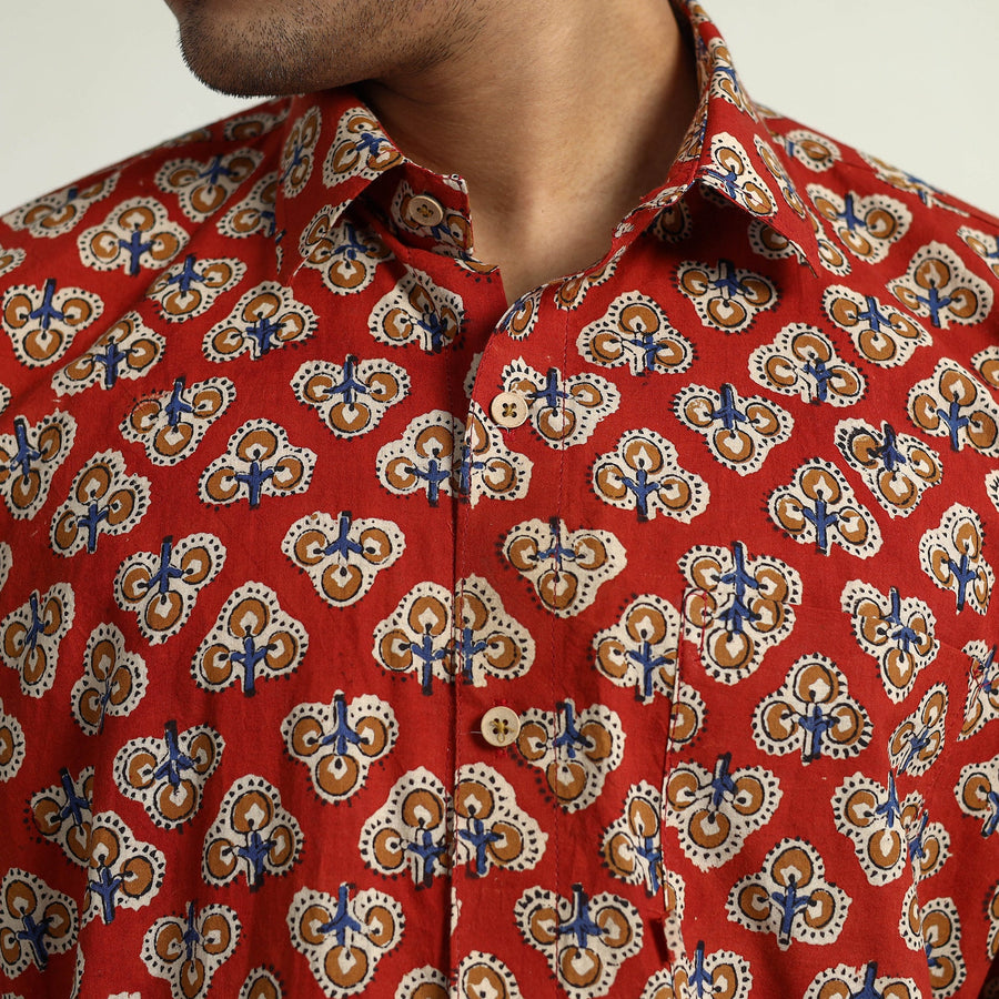 This red bagru block-printed cotton men's half-sleeve shirt is the perfect blend of style and comfort. This shirt is carefully crafted from cotton fabric, which ensures all-day comfort. The crisp wooden buttons add a touch of natural charm, while the patch pocket on the front offers convenience and practicality.