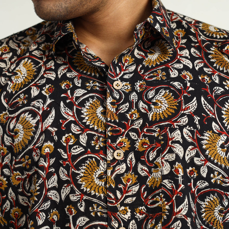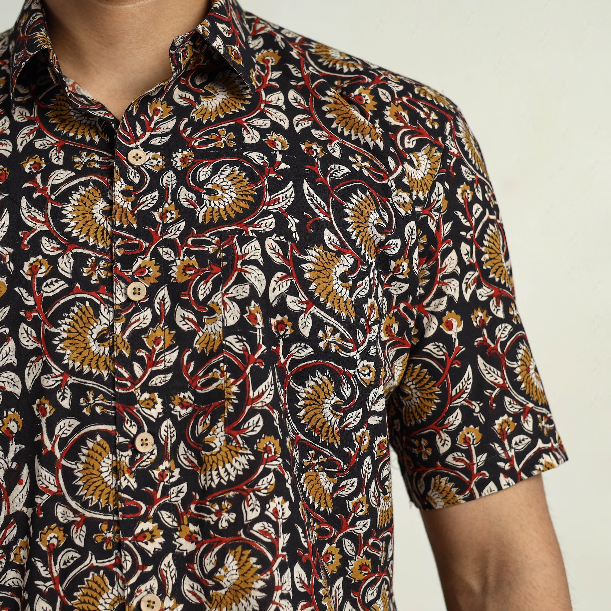 This black bagru block-printed cotton men's half-sleeve shirt is the perfect blend of style and comfort. This shirt is carefully crafted from cotton fabric, which ensures all-day comfort. The crisp wooden buttons add a touch of natural charm, while the patch pocket on the front offers convenience and practicality.