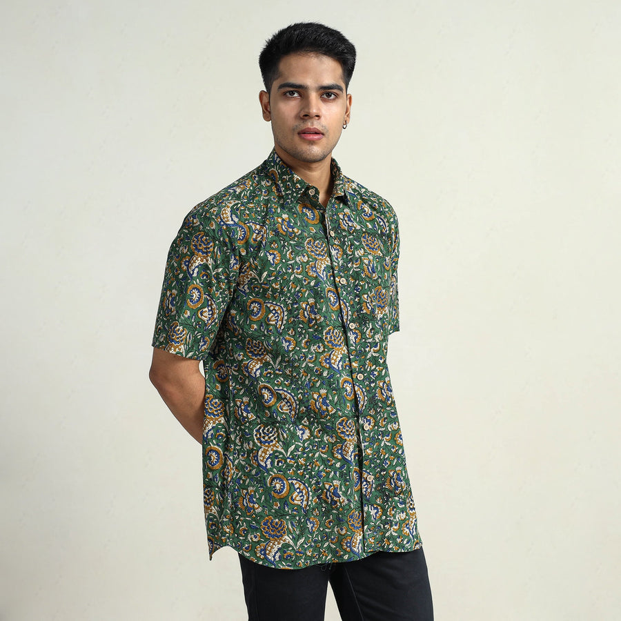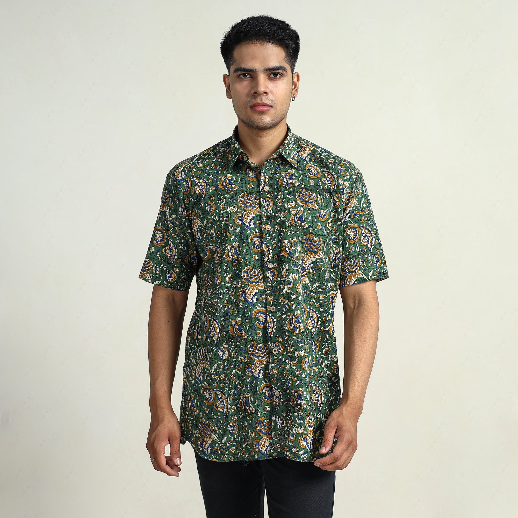 This green bagru block-printed cotton men's half-sleeve shirt is the perfect blend of style and comfort. This shirt is carefully crafted from cotton fabric, which ensures all-day comfort. The crisp wooden buttons add a touch of natural charm, while the patch pocket on the front offers convenience and practicality.
