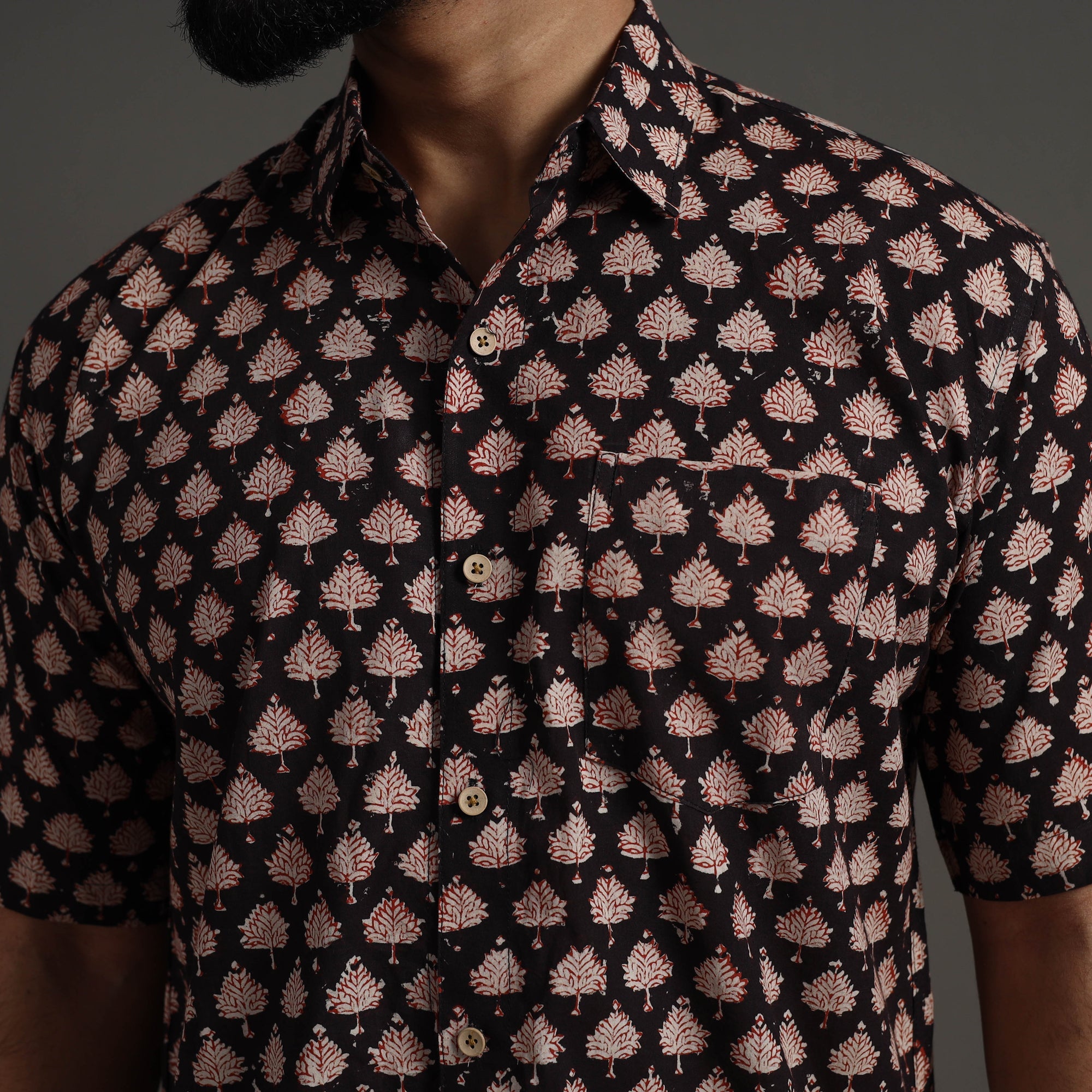 This black bagru block-printed cotton men's half-sleeve shirt is the perfect blend of style and comfort. This shirt is carefully crafted from cotton fabric, which ensures all-day comfort. The crisp wooden buttons add a touch of natural charm, while the patch pocket on the front offers convenience and practicality.