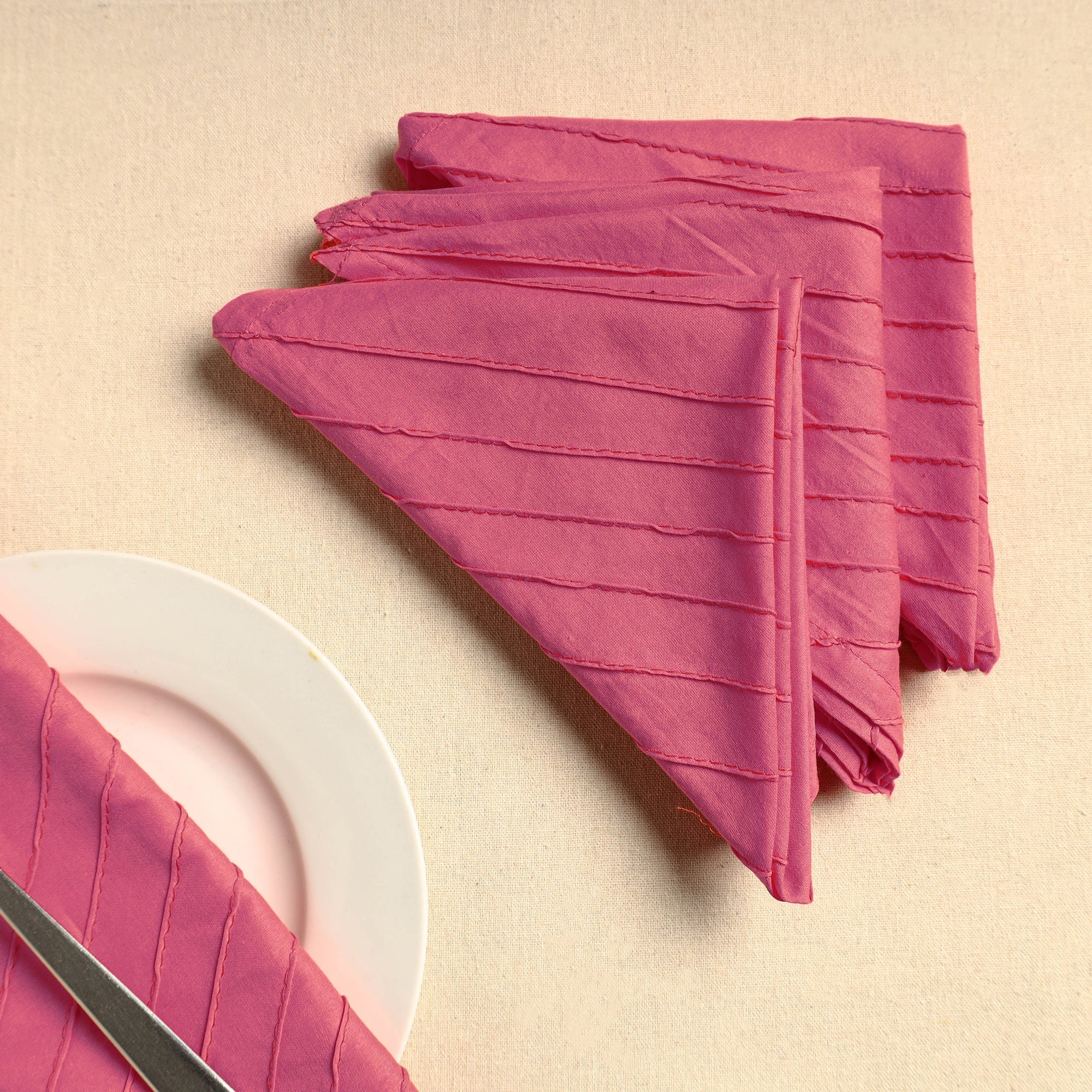 Pink pintuck plain cotton table napkins offer a blend of elegance and practicality. Crafted from high-quality cotton, their pintuck detailing adds a stylish touch. Ideal for formal or casual dining, they enhance table settings with a sophisticated charm, ensuring durability and easy maintenance.