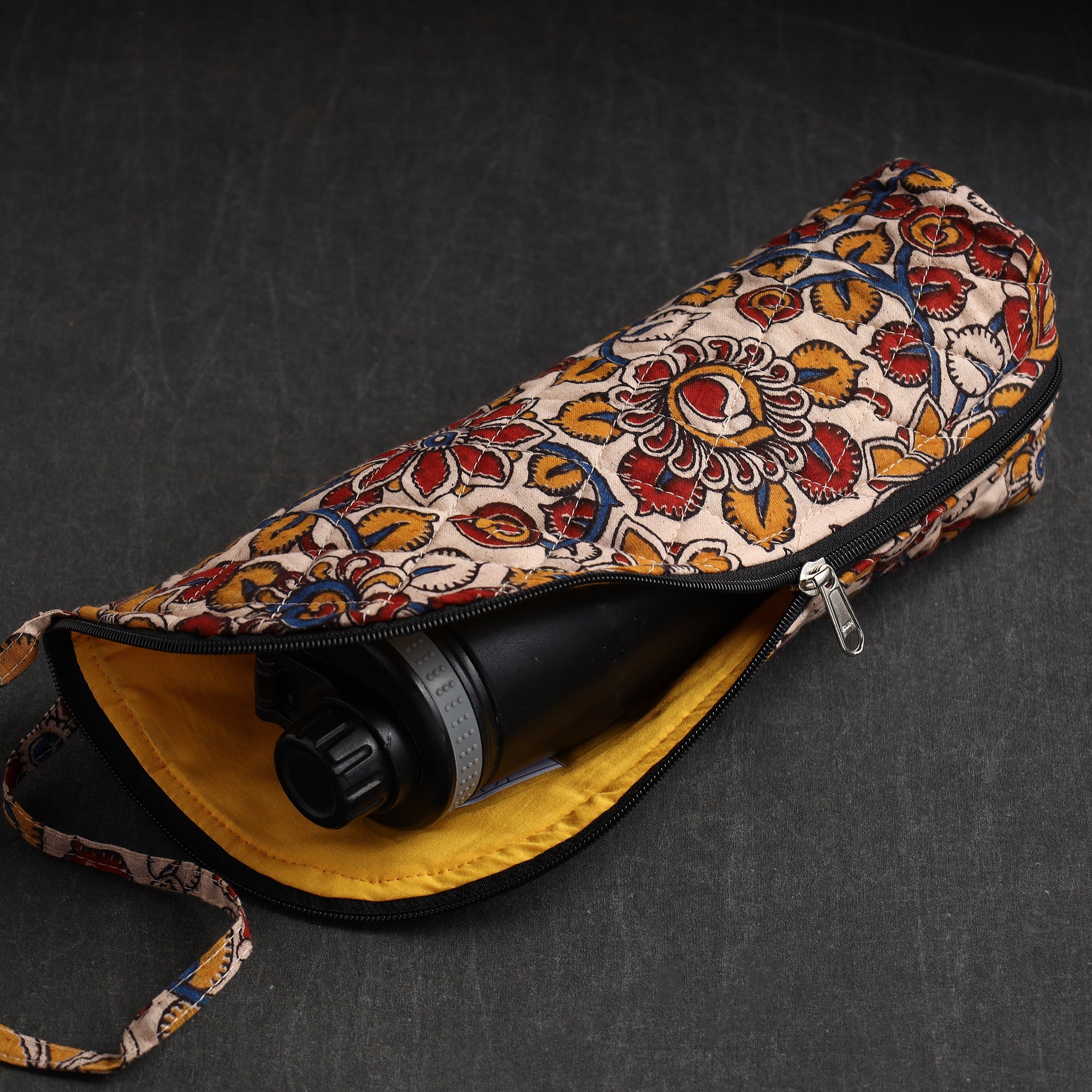 This handmade beige cotton water bottle cover is a charming blend of tradition and functionality. It has a foam layer lining inside and a zipper main closure. Crafted from high-quality cotton, this cover adds a touch of elegance to your hydration routine.