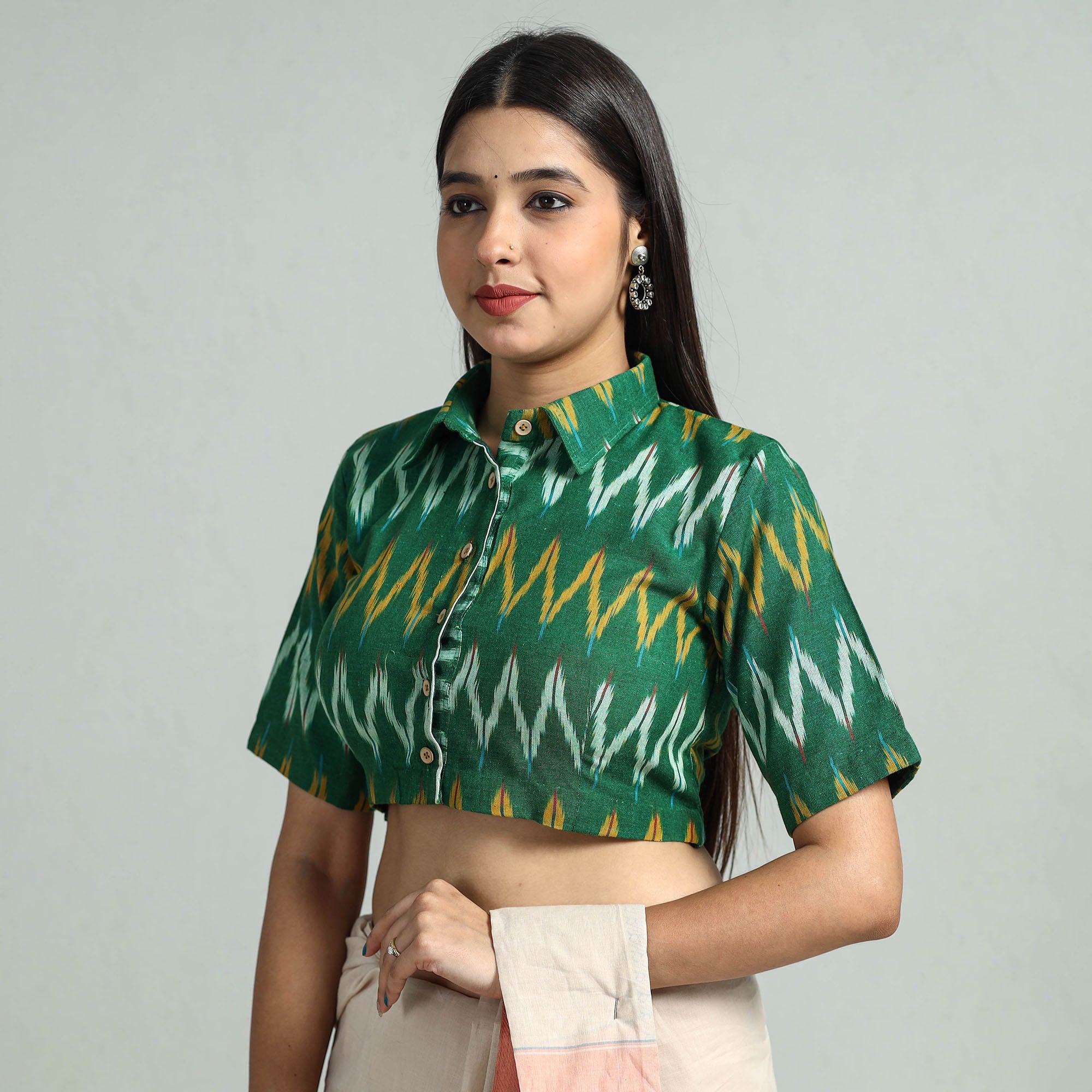 This pochampally ikat cotton blouse is seamlessly stitched with padded comfort for a relaxed fit. Crafted from cotton fabric known for its breathability and comfort, it features half sleeves that provide balanced coverage, making it perfect for any occasion. It is adorned with wooden button locks, adding a natural and rustic element to the design.