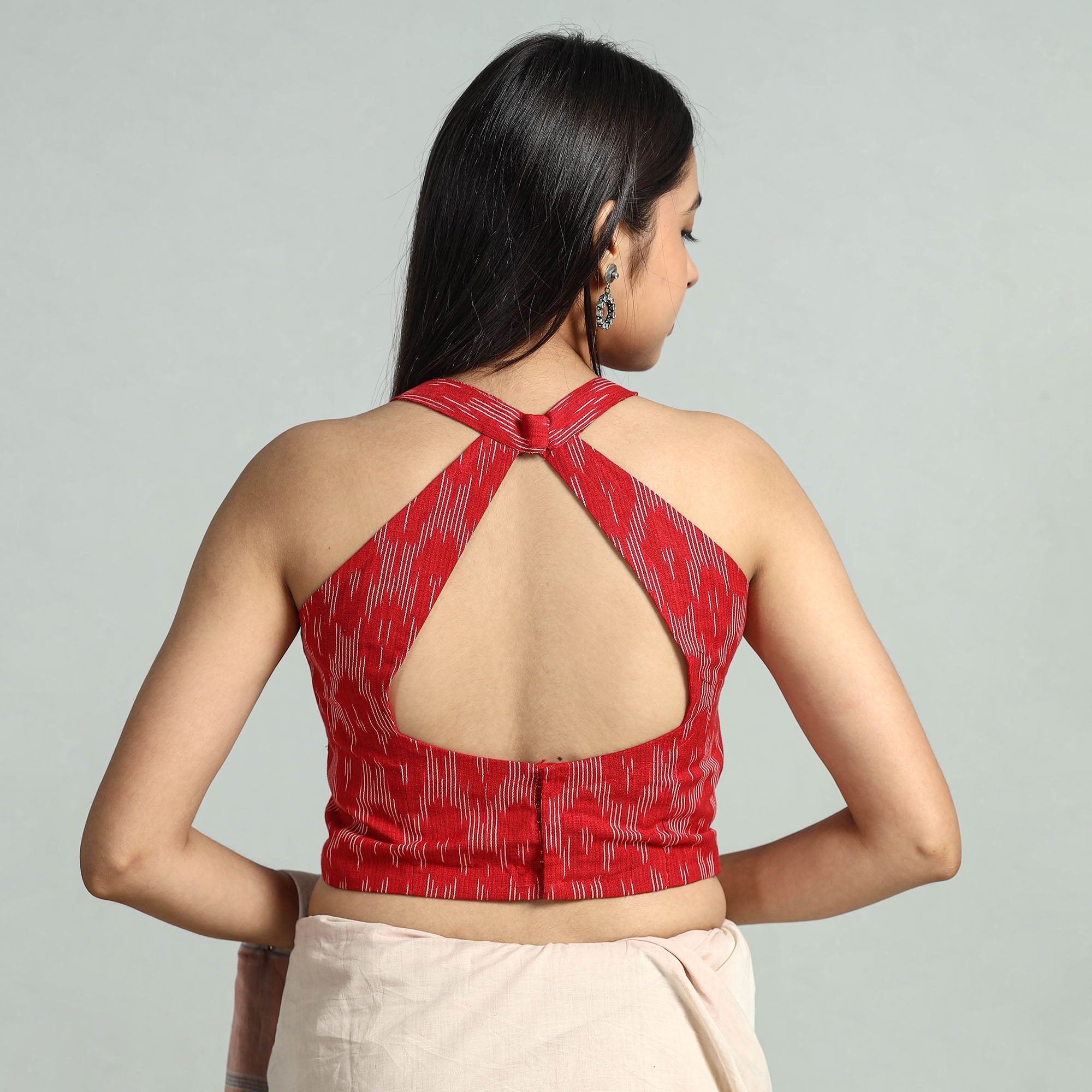 This pochampally ikat cotton blouse is seamlessly stitched with padded comfort for a relaxed fit. Crafted from cotton fabric known for its breathability and comfort, this sleeveless blouse. the hook lock adds convenience that allows for easy wear and removal, making it perfect for any occasion.